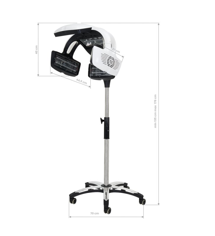 The professional Gabbiano Y-707 standing infrazone is a device necessary when performing treatments such as coloring, brightening, care or drying, as well as permanent styling and other services where high temperature is useful. The device significantly shortens the duration of the treatment , allowing for a larger number of clients while maintaining the high quality of services provided in the salon .