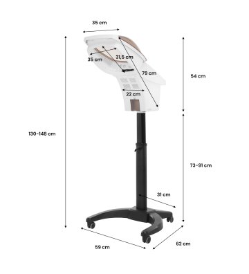 The white plastic housing makes the device durable and easy to keep clean . The opening dome significantly improves the cleaning of the product. The stand with simple, manual adjustment in the range of 18 cm is equipped with a base with practical wheels , which allows you to easily move the device at any time.