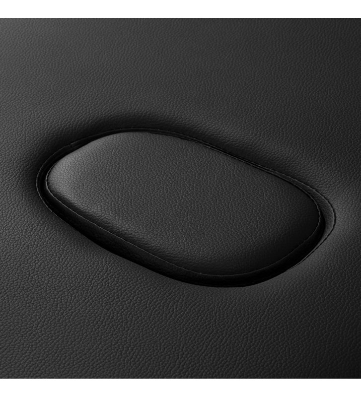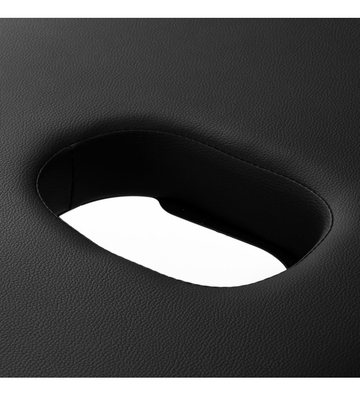 Dla zapewnienia maksymalnej wygody osoba korzystająca ze stołu może oprzeć głowę na ergonomicznym zagłówku, który znajduje się w zestawie. Element ten jest łatwy w regulacji – umożliwia dostosowanie kąta nachylenia w dwóch płaszczyznach, co pozwala precyzyjnie dopasować jego ustawienie do potrzeb użytkownika oraz charakteru wykonywanego zabiegu. W przypadku terapii prowadzonych w pozycji na plecach zagłówek można zdemontować, korzystając zamiast niego ze specjalnego otworu w blacie. Gdy nie jest używany, otwór można zakryć dołączoną zaślepką, przywracając powierzchni estetyczny i jednolity wygląd.