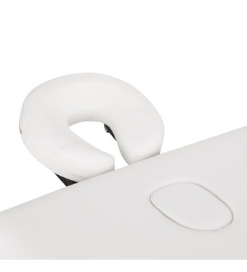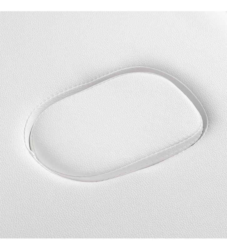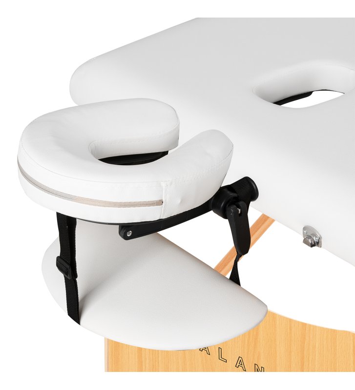 Dla zapewnienia maksymalnej wygody osoba korzystająca ze stołu może oprzeć głowę na ergonomicznym zagłówku, który znajduje się w zestawie. Element ten jest łatwy w regulacji – umożliwia dostosowanie kąta nachylenia w dwóch płaszczyznach, co pozwala precyzyjnie dopasować jego ustawienie do potrzeb użytkownika oraz charakteru wykonywanego zabiegu. W przypadku terapii prowadzonych w pozycji na plecach zagłówek można zdemontować, korzystając zamiast niego ze specjalnego otworu w blacie. Gdy nie jest używany, otwór można zakryć dołączoną zaślepką, przywracając powierzchni estetyczny i jednolity wygląd.