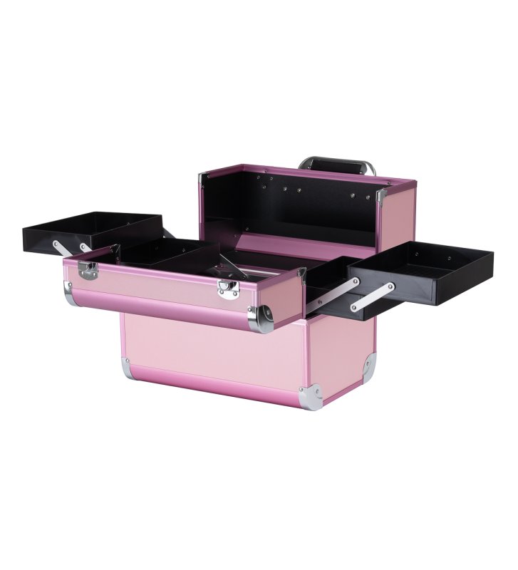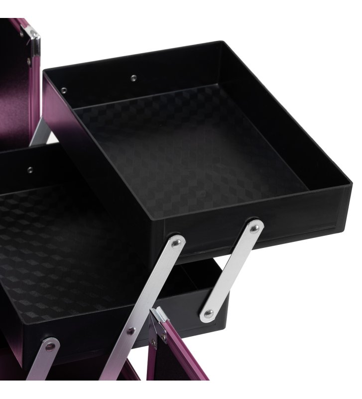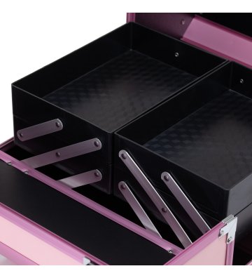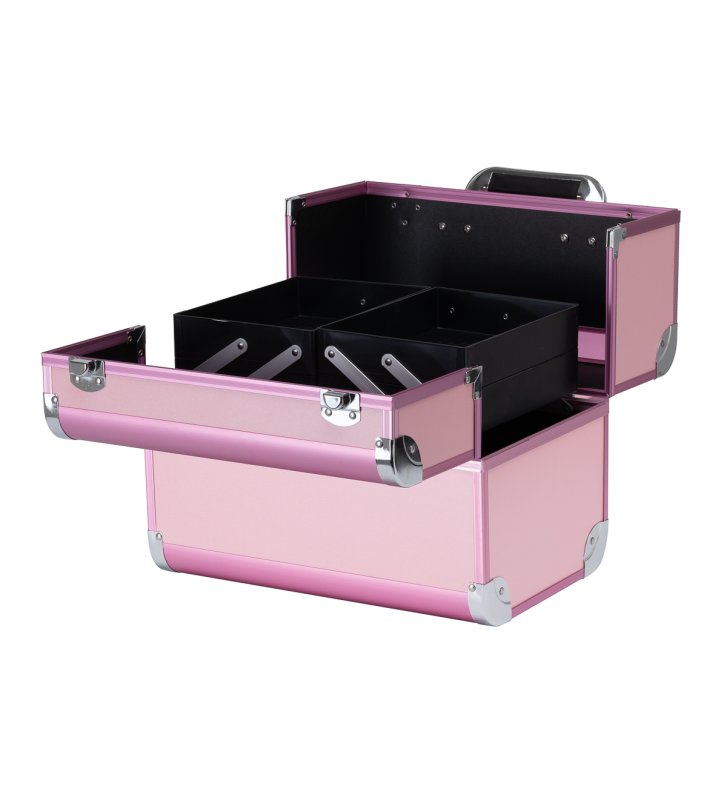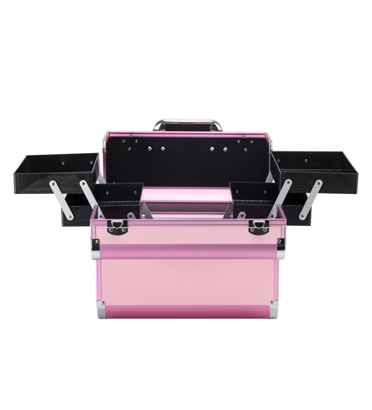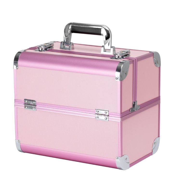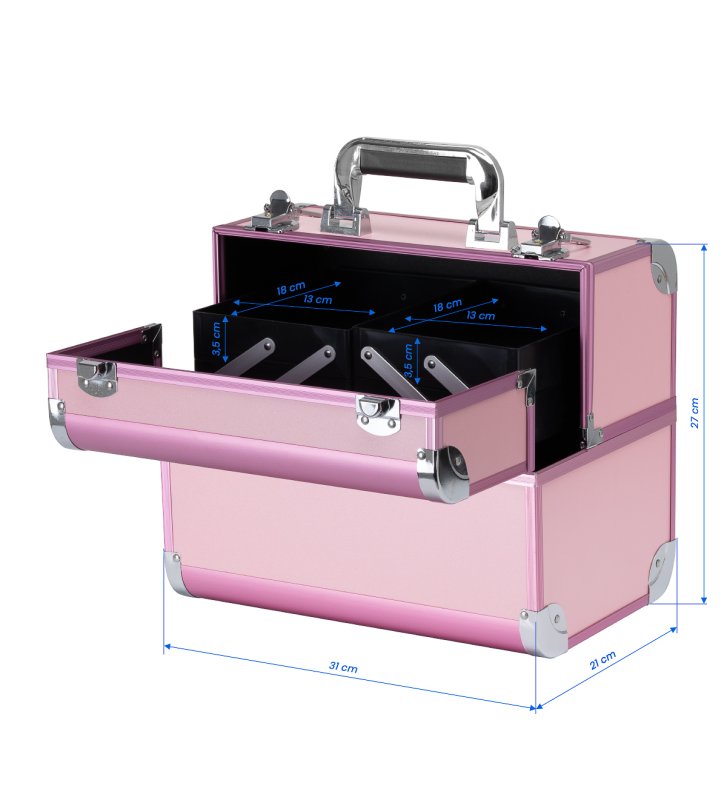 Nowoczesny design z gładkim wykończeniem ścianek w odcieniach różu z metalicznymi akcentami dodaje elegancji. Rączka ułatwia transport, co jest szczególnie ważne dla mobilnych stylistów. Wykonany z wytrzymałych, odpornych na uszkodzenia materiałów zapewnia komfort użytkowania na co dzień. Solidne zamknięcie na zatrzaski z kluczykiem zapewnia ochronę zawartości, a lekka, trwała konstrukcja sprawia, że kuferek jest łatwy do przenoszenia.