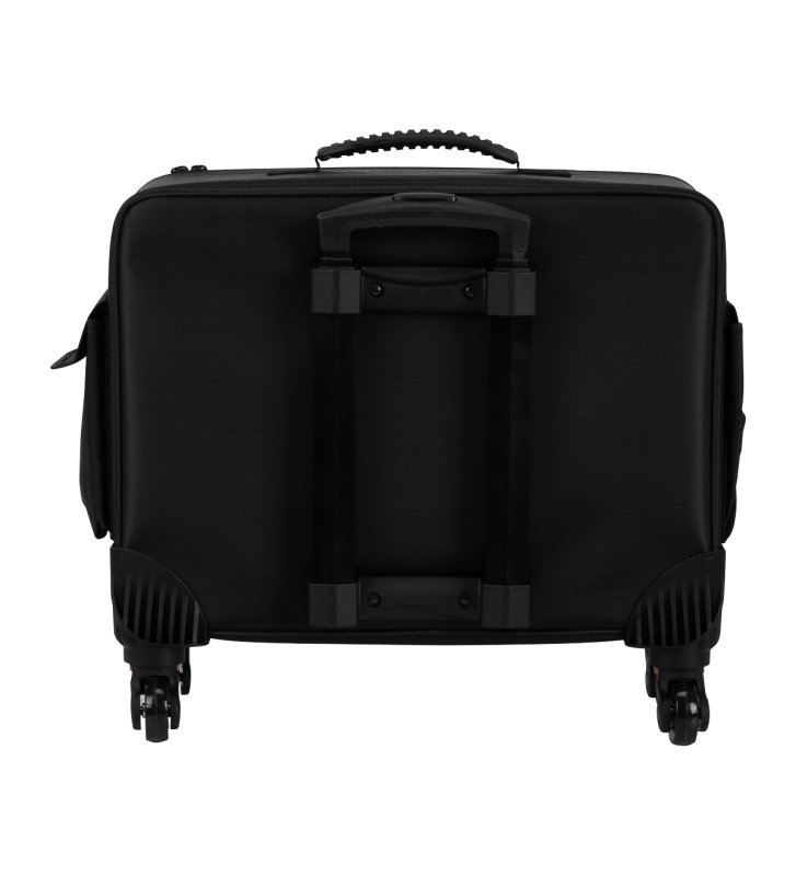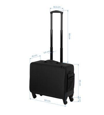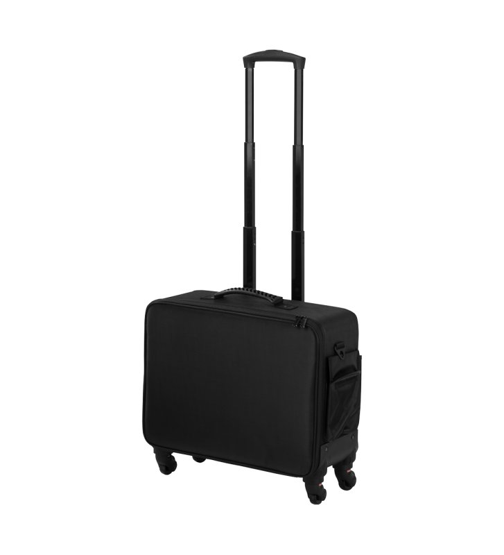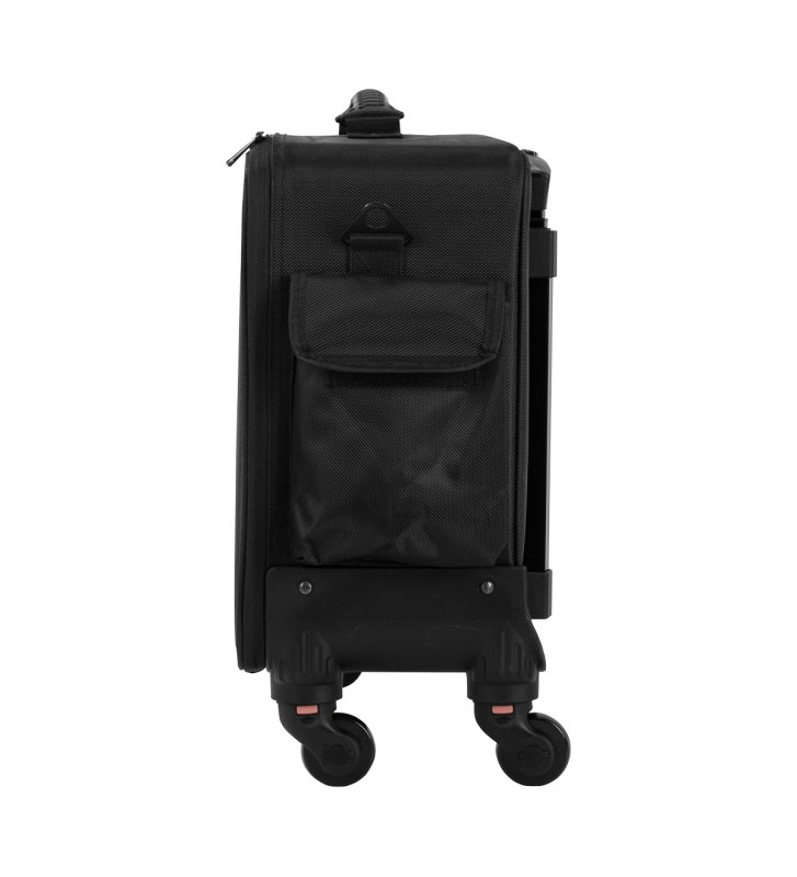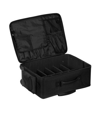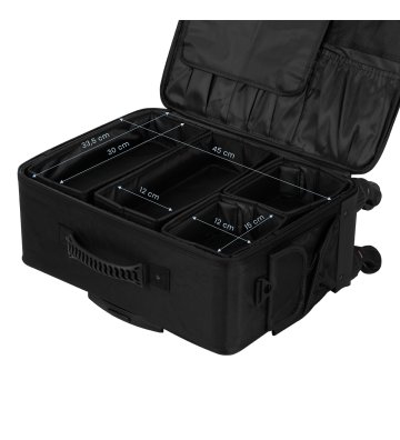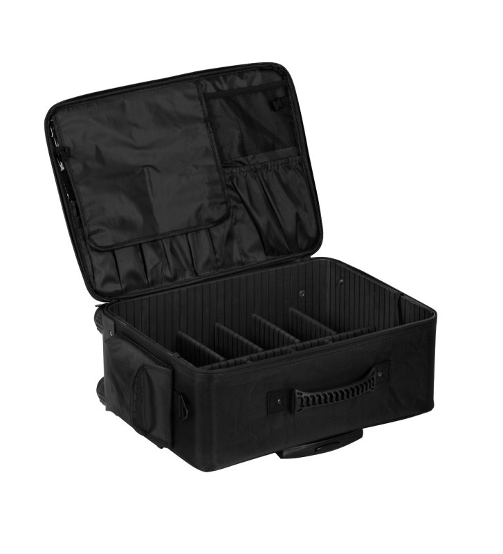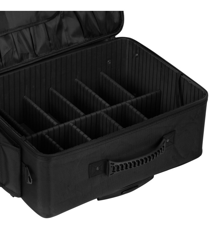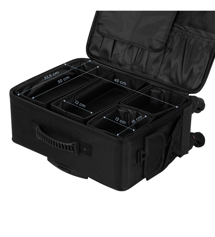 Walizka została wykonana z wytrzymałego, wodoodpornego nylonu, dzięki czemu jest odporna na uszkodzenia i łatwa w czyszczeniu. Uniwersalny czarny kolor nadaje mu elegancki wygląd, a liczne kieszenie, w tym duża główna komora z regulowanymi przegródkami oraz miejscem na cztery organizery (dwa mniejsze, dwa większe), zapewniają maksymalną funkcjonalność. Przemyślana konstrukcja ułatwia organizację kosmetyków i akcesoriów, pomagając utrzymać porządek. Nowoczesny design, mobilność i praktyczność sprawiają, że walizka jest niezastąpionym narzędziem dla profesjonalistów z branży beauty.