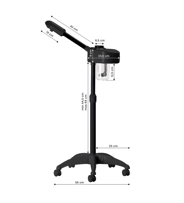 The wapozon is made of durable plastic in shades of black, which makes the device easy to keep clean . The stand is equipped with height adjustment in the range of 44.5-69 cm , which allows you to set the device at the right level to ensure comfort for the person performing the treatment. The wapozon nozzle can be rotated , which increases the range of possible settings. The five-arm base with wheels improves mobility , making it easier to freely move the device.