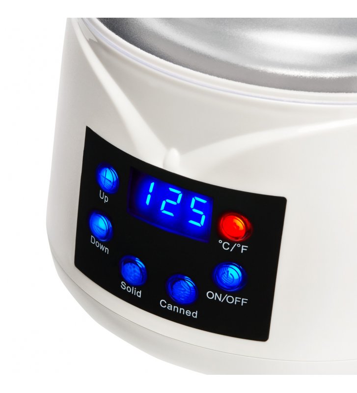 Professional wax heater with a thermostat and temperature display and the ability to work in two modes. Suitable for all types of waxes for depilation in a can, hard wax, pellets (the heater comes with a pot in which you can melt hard or pearl wax).
