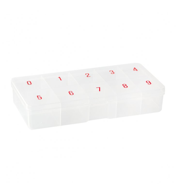 Praktyczny organizer z dziesięcioma ponumerowanymi przegródkami pozwoli zaprowadzić porządek pośród drobnych akcesoriów do stylizacji paznokci czy przedłużania rzęs. Zróżnicowane wymiary pojemniczków dają możliwość przechowywania ozdób i tipsów o różnych wielkościach. Pudełko sprawdzi się również do trzymania niewielkich przyborów do innych zabiegów kosmetycznych, a dzięki zamknięciu produkty nie wysypią się w czasie transportu.