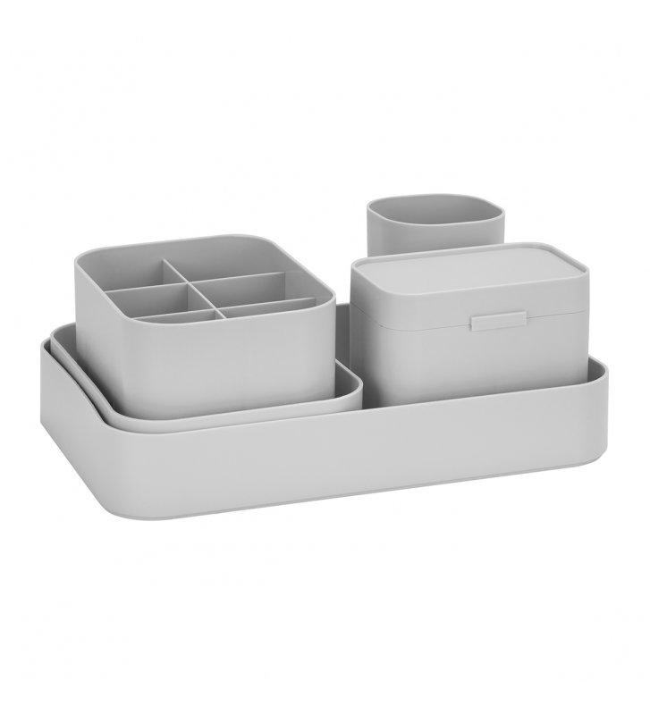 Składający się z pięciu elementów zestaw pojemników do przechowywania pozwoli zorganizować wszelkie akcesoria i przyrządy potrzebne w profesjonalnych salonach kosmetycznych czy fryzjerskich, ale doskonale sprawdzi się również w domu. Pojemniki z tworzywa sztucznego są łatwe do utrzymania w czystości. Neutralny szary kolor i prosty design doskonale wpiszą się w stylistykę każdego wnętrza. Elementy zestawu sprawdzą się również jako wkłady do szuflad i szaf.