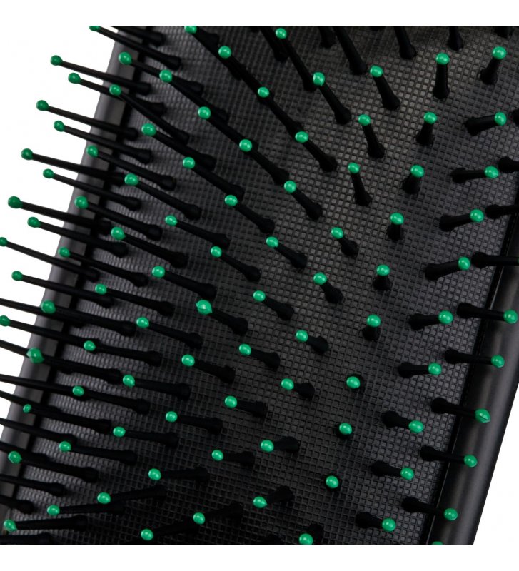 Płaska i pneumatyczna szczotka syntetycznym włosiem z zaokrąglonymi końcówkami doskonale sprawdzi się w codziennym użyciu. Szczotka szybko i bez szarpania rozplątuje zarówno suche, jak i mokre włosy. Szczotka świetnie sprawdzi się przy każdym rodzaju włosów. Zastosowanie owalnych zakończeń gwarantuje maksymalną ochronę wrażliwej skóry oraz komfort podczas stylizacji.