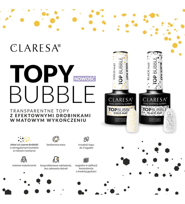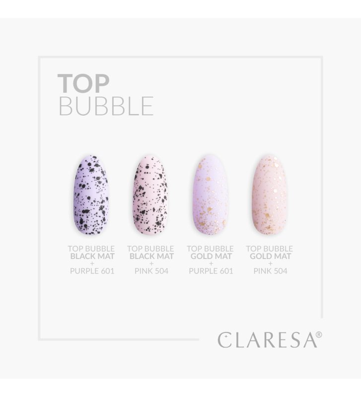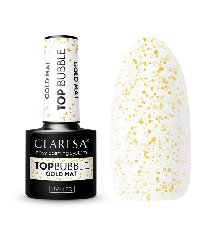 Transparentny matowy top ze złotymi drobinkami Bubble Gold Matt No Wipe będzie prezentować się świetnie na każdym lakierze hybrydowym, niezależnie od tego, czy masz na paznokciach jednolity kolor, baby boomera, czy też ombre. Zatopione w produkcie drobinki różnią się wielkością i kształtem, dzięki czemu Twój manicure stanie się jeszcze bardziej wielowymiarowy, a matowe wykończenie nada mu elegancji.