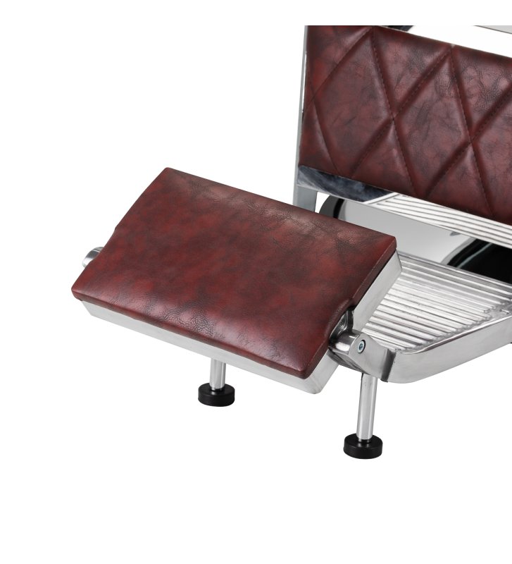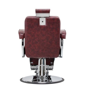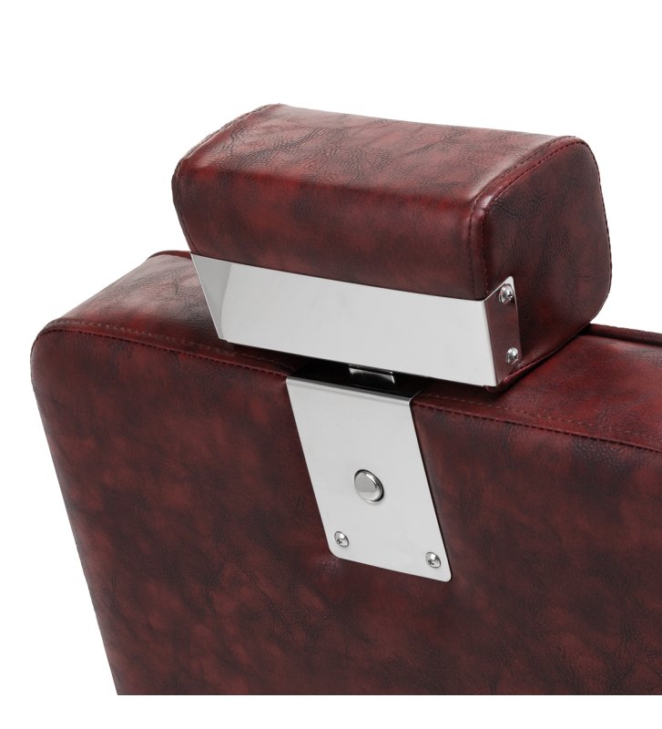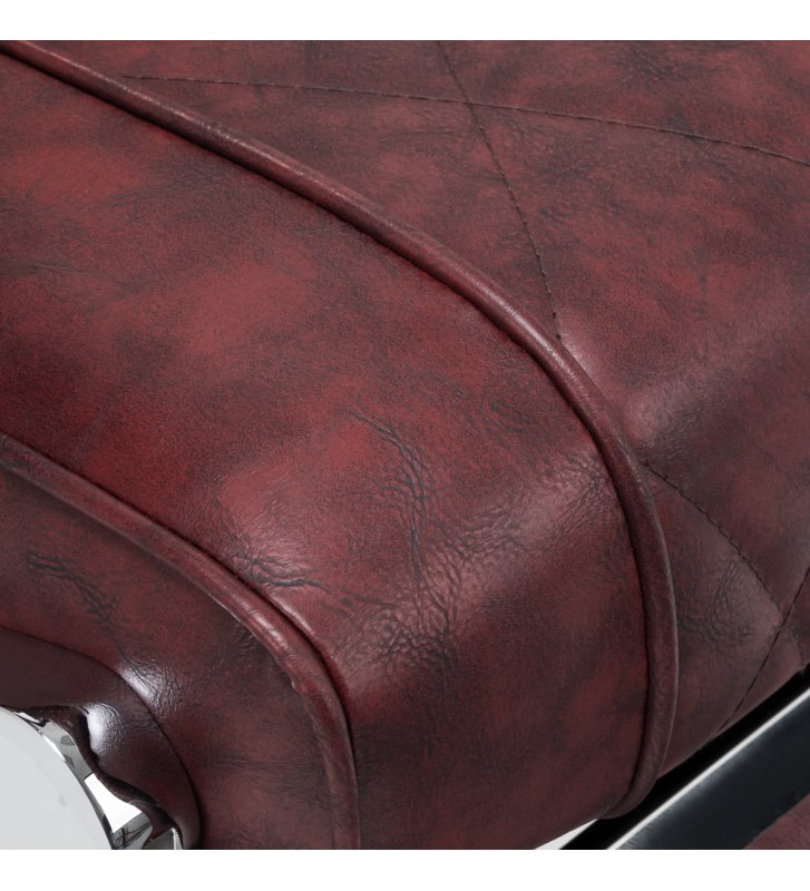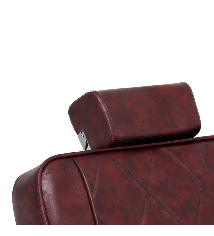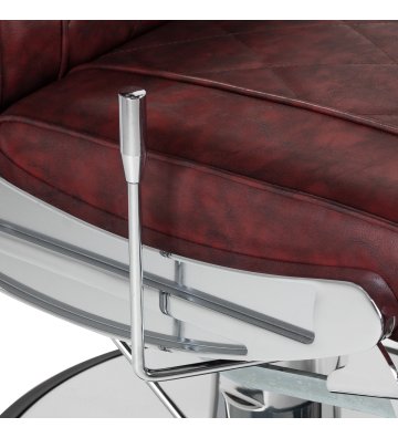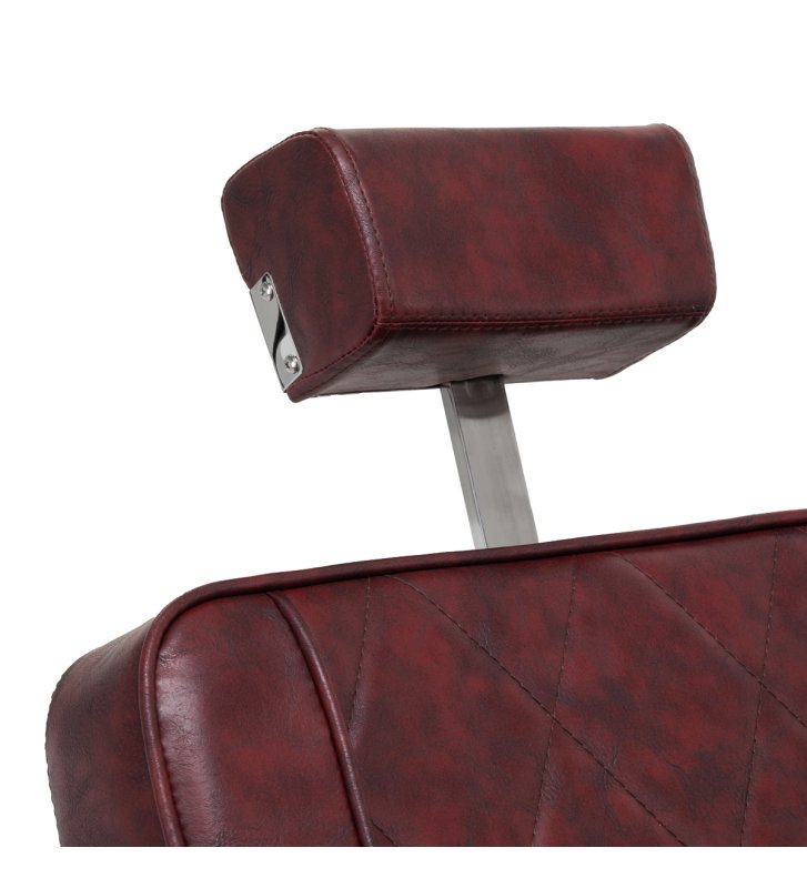 Solidna konstrukcja okrągłej podstawy zapewnia stabilność oraz wysoki komfort użytkowania. Wypełnienie siedziska z odpornej na odkształcenia pianki oraz obicie wykonane z przyjemnej w dotyku skóry syntetycznej o matowym wykończeniu zapewniają trwałość mebla oraz jego komfortowe użytkowanie przez długi czas. Stylowe przeszycia na tapicerce nadają fotelowi charakteru, przywodząc na myśl design motoryzacyjny, co podkreśla jego elegancki wygląd. Sprawiają również, że sprzęt jest odporny na wilgoć, wytrzymały oraz łatwy do czyszczenia. Pokrycie w odcieniach bordo nadaje mu wyjątkowego charakteru, a minimalistyczny styl pozwala mu wpasować się w wystrój każdego salonu barberskiego.