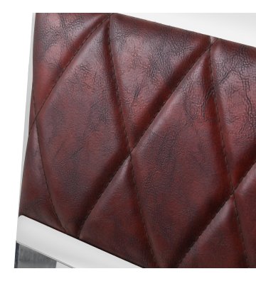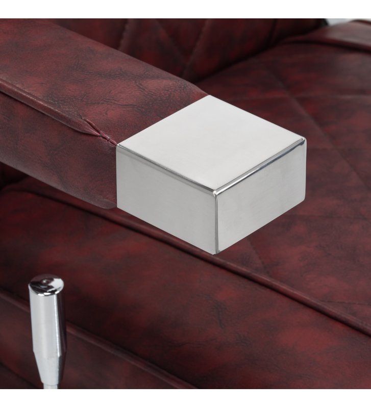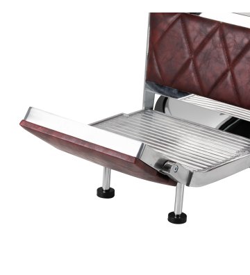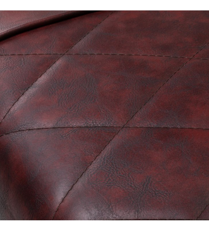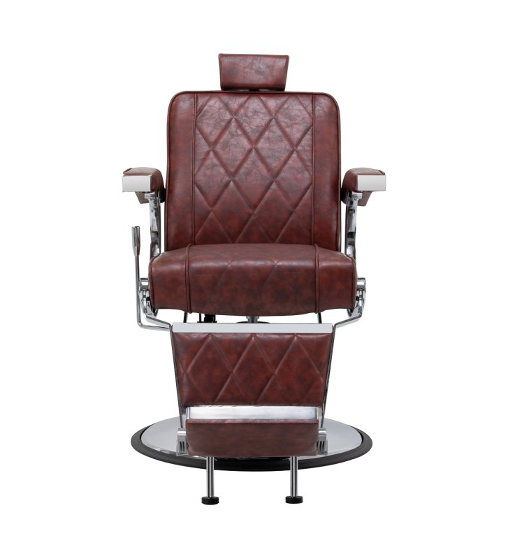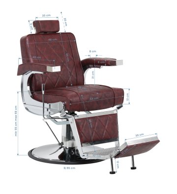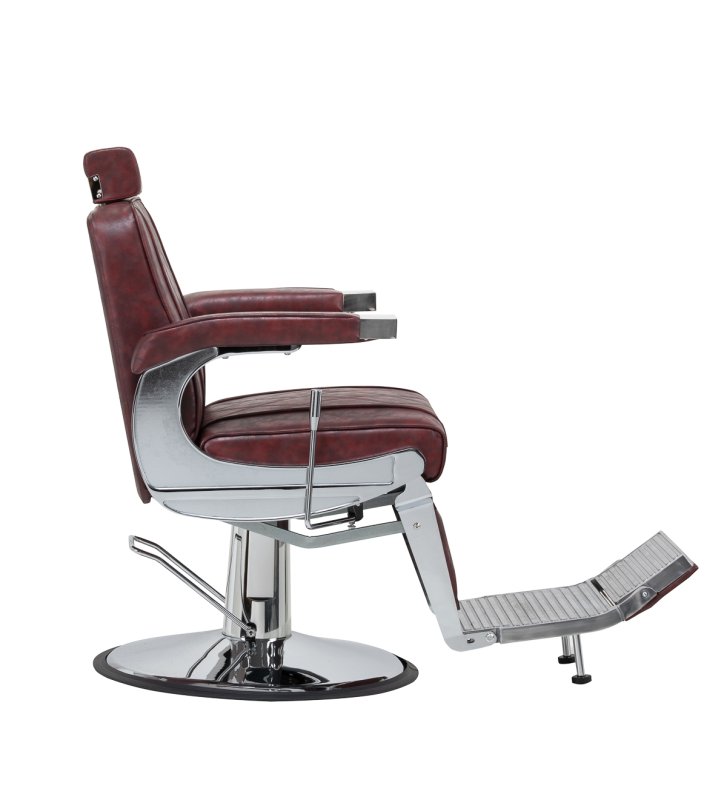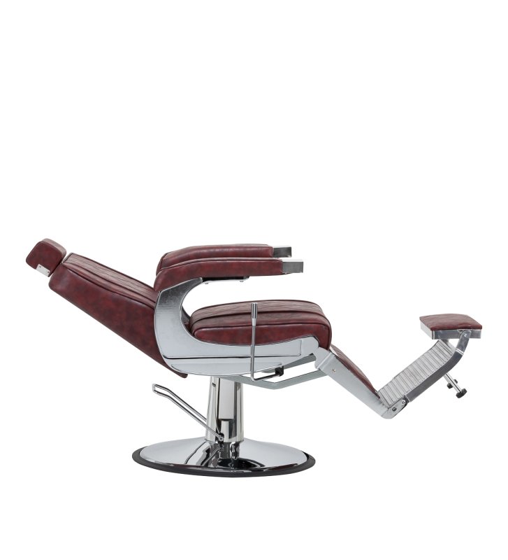 Solidna konstrukcja okrągłej podstawy zapewnia stabilność oraz wysoki komfort użytkowania. Wypełnienie siedziska z odpornej na odkształcenia pianki oraz obicie wykonane z przyjemnej w dotyku skóry syntetycznej o matowym wykończeniu zapewniają trwałość mebla oraz jego komfortowe użytkowanie przez długi czas. Stylowe przeszycia na tapicerce nadają fotelowi charakteru, przywodząc na myśl design motoryzacyjny, co podkreśla jego elegancki wygląd. Sprawiają również, że sprzęt jest odporny na wilgoć, wytrzymały oraz łatwy do czyszczenia. Pokrycie w odcieniach bordo nadaje mu wyjątkowego charakteru, a minimalistyczny styl pozwala mu wpasować się w wystrój każdego salonu barberskiego.
