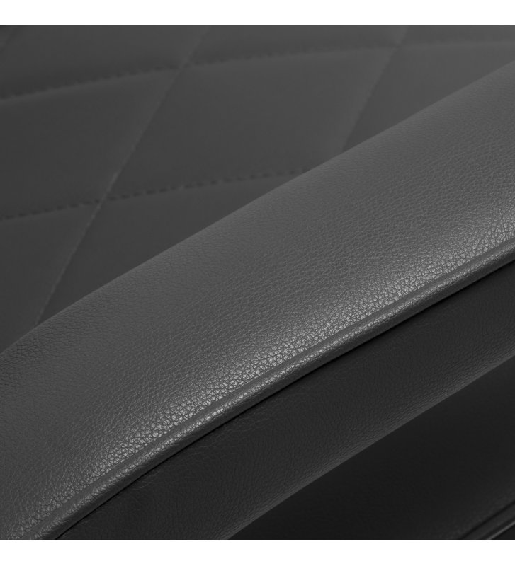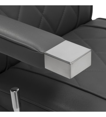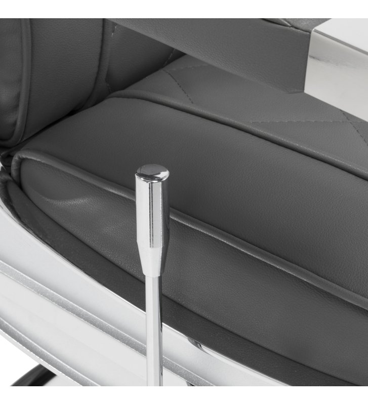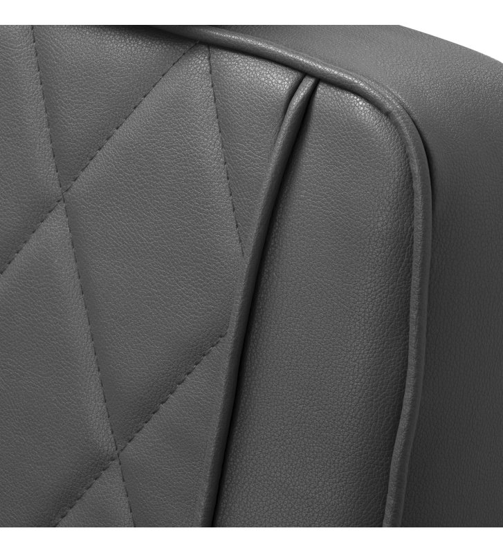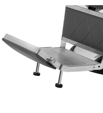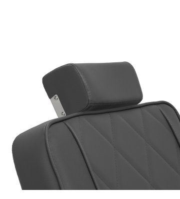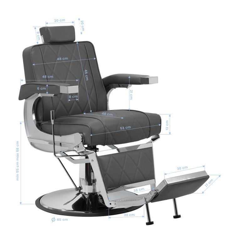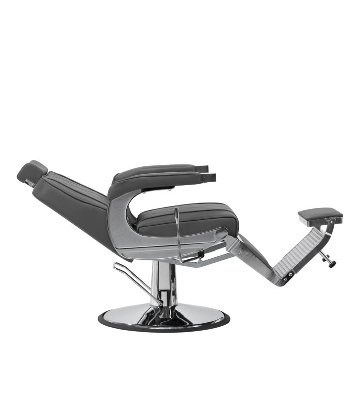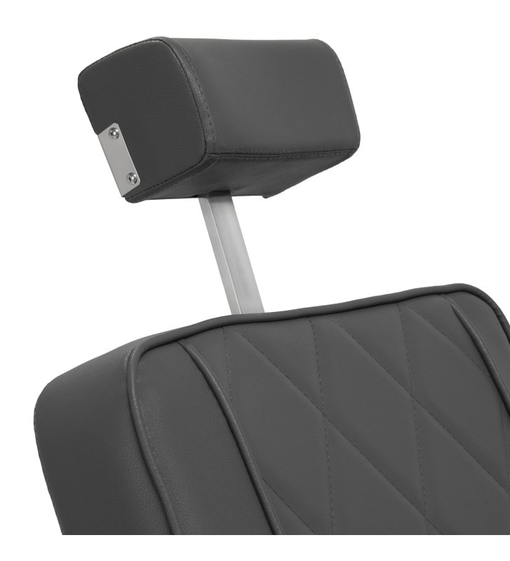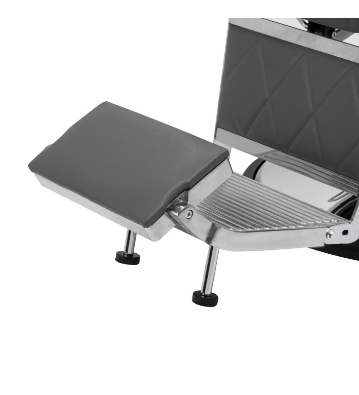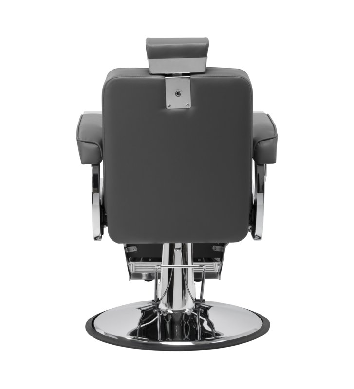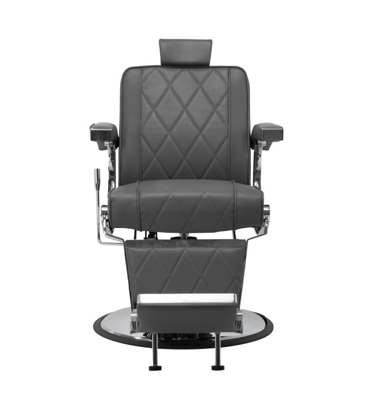 Solidna konstrukcja okrągłej podstawy zapewnia stabilność oraz wysoki komfort użytkowania. Wypełnienie siedziska z odpornej na odkształcenia pianki oraz obicie wykonane z przyjemnej w dotyku skóry syntetycznej o matowym wykończeniu zapewniają trwałość mebla oraz jego komfortowe użytkowanie przez długi czas. Stylowe przeszycia na tapicerce nadają fotelowi charakteru, przywodząc na myśl design motoryzacyjny, co podkreśla jego elegancki wygląd. Sprawiają również, że sprzęt jest odporny na wilgoć, wytrzymały oraz łatwy do czyszczenia. Pokrycie w odcieniach szarości nadaje mu wyjątkowego charakteru, a minimalistyczny styl pozwala mu wpasować się w wystrój każdego salonu barberskiego.