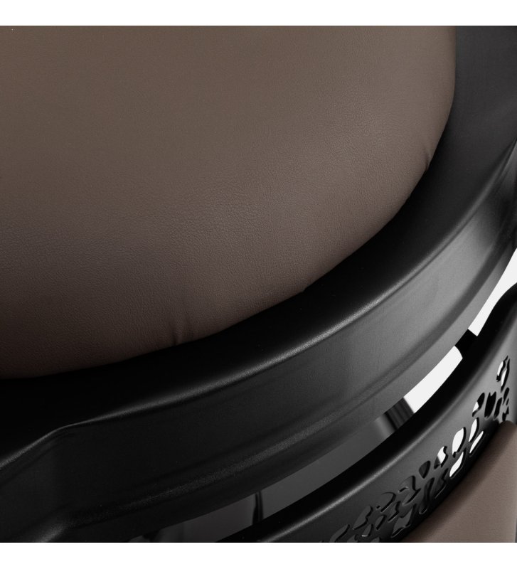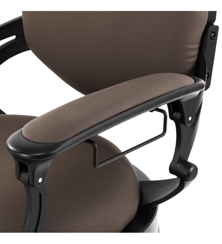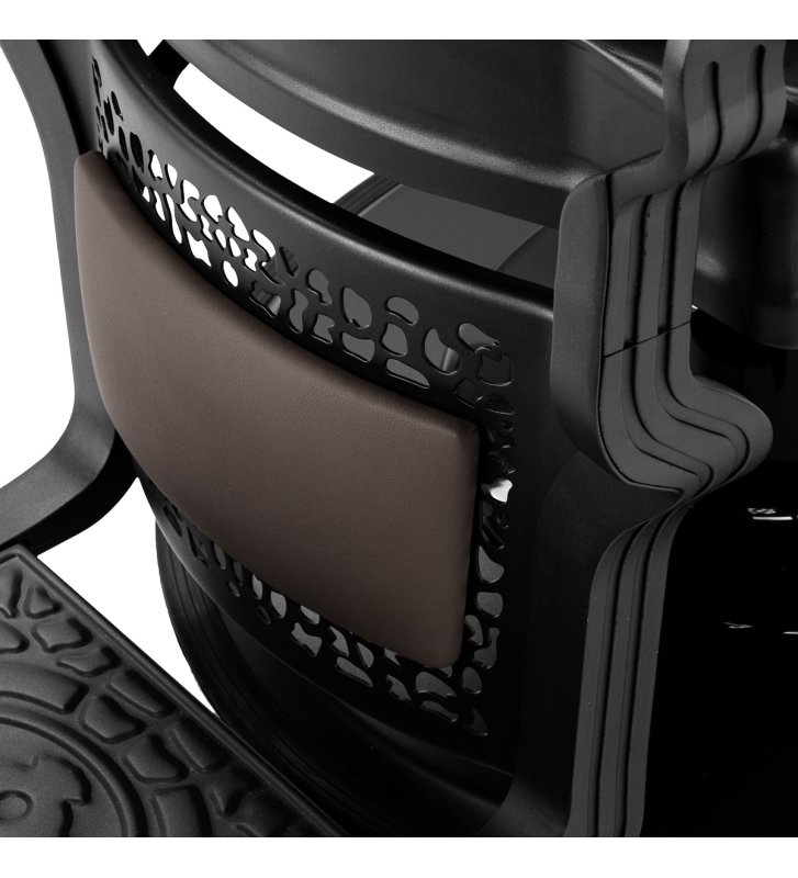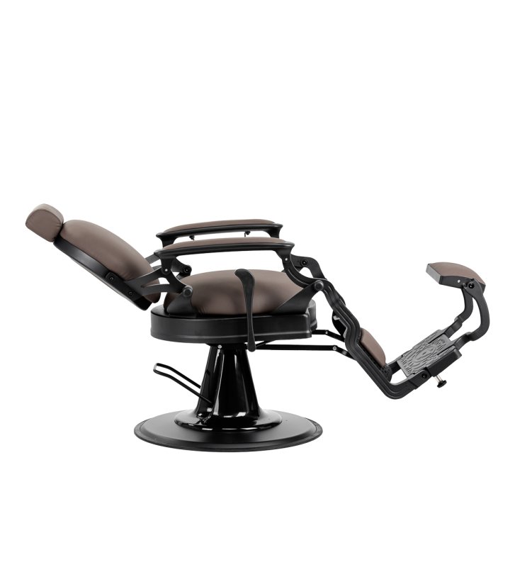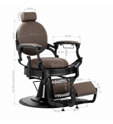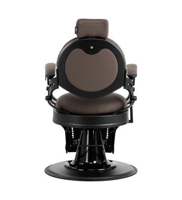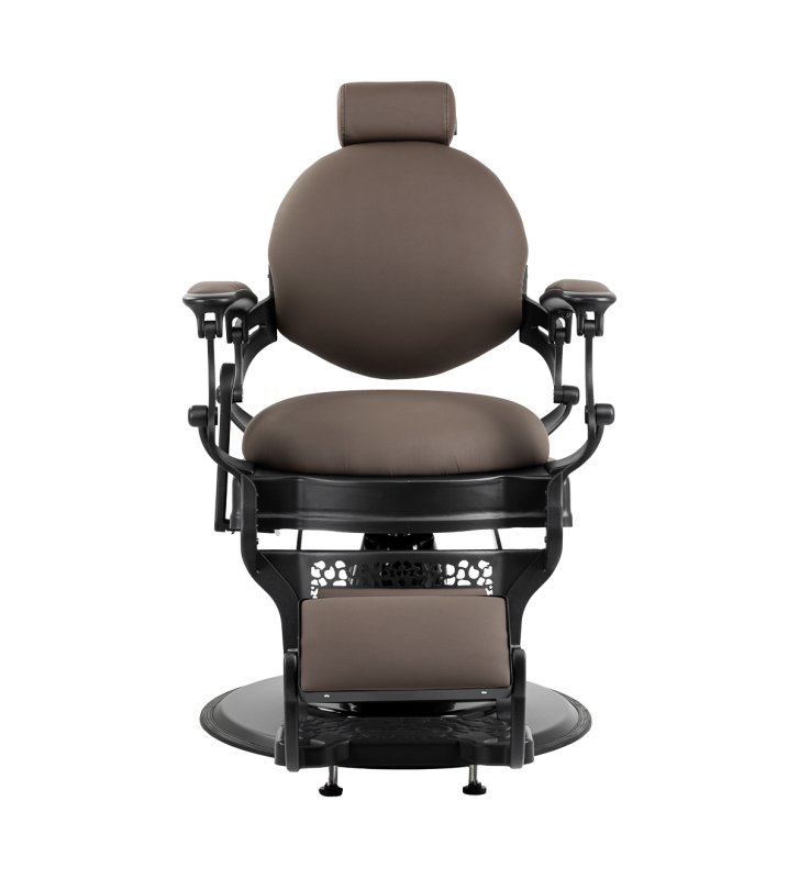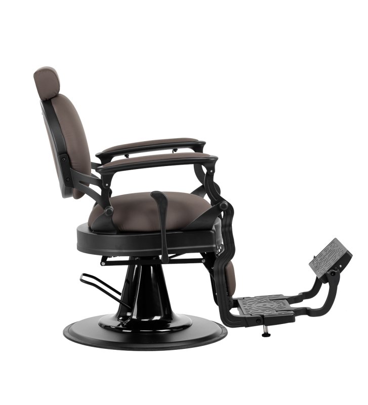 Solidna konstrukcja podstawy zapewnia stabilność oraz wysoki komfort użytkowania. Wypełnienie siedziska z trwałej, odpornej na odkształcenia pianki oraz obicie wykonane z przyjemnej w dotyku skóry syntetycznej o matowym wykończeniu zapewniają trwałość mebla oraz jego komfortowe użytkowanie przez długi czas. Zastosowane materiały sprawiają również, że sprzęt jest odporny na wilgoć, wytrzymały oraz łatwy do czyszczenia. Pokrycie w odcieniach brązu oraz zdobiony podnóżek nadają mu wyjątkowego charakteru. Fotel o charakterystycznym designie, nawiązującym do stylu vintage, doskonale pasuje do klimatu salonów barberskich, podkreślając ich wyjątkową atmosferę.