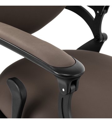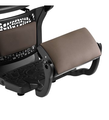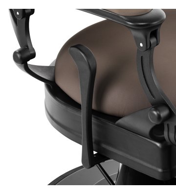 Komfortowe siedzisko wypełnione pianką gwarantuje klientowi wygodę w trakcie różnorodnych usług. Wyprofilowane oparcie pozwala na zajęcie dogodnej pozycji, zapewniając doskonałe wsparcie pleców, co jest istotne szczególnie podczas dłuższych zabiegów. Wyposażenie fotela w mechanizm pełnego obrotu sprawia, że praca staje się bardziej efektywna i wygodna. Tapicerowane podłokietniki umieszczone na odpowiedniej wysokości umożliwiają prawidłowe ułożenie barków klienta – sprawia to, że nie chowa głowy w ramionach ani się nie garbi – znacząco ułatwiając wykonywanie precyzyjnych zabiegów. Uchwyt na ręcznik pod podłokietnikiem znacznie wpływa na efektywność pracy. Otwór pomiędzy oparciem a siedziskiem ułatwia zachowanie czystości w salonie, pozwalając w łatwy sposób wymieść włosy z każdego zakamarka fotela. Usprawnia to przygotowanie stanowiska pracy pomiędzy klientami.