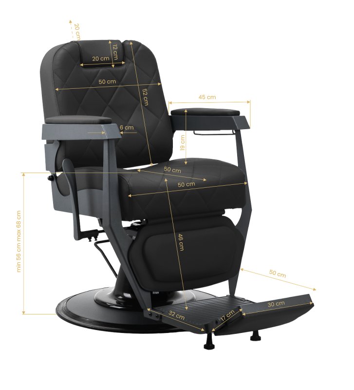Wydajny podnośnik hydrauliczny umożliwia płynną regulację wysokości siedziska w zakresie 56-68 cm, nawet wtedy, gdy klient siedzi na fotelu. Zapewnia to ergonomię pracy i pozwala dostosować wysokość siedziska do wzrostu zarówno klienta, jak i barbera. Odchylane oparcie i regulowany podnóżek pozwalają ustawić fotel w pozycji półleżącej, co zapewnia optymalny dostęp podczas takich usług jak golenie czy pielęgnacja brody. Wysuwany o 20 cm zagłówek gwarantuje stabilne podparcie głowy, niezależnie od wzrostu klienta.