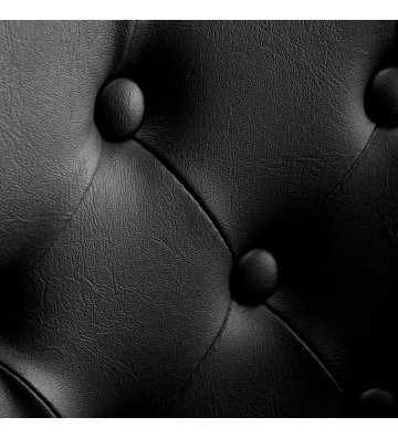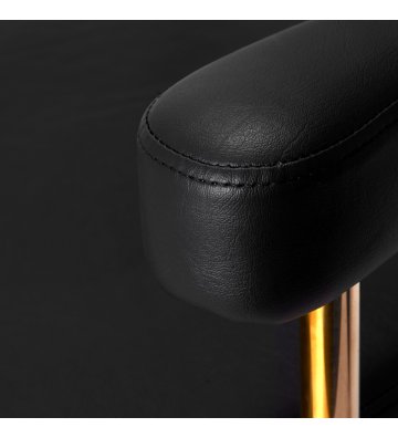 Fotel wypełniony jest pianką, która jest trwała i nie odkształca się, zapewniając komfortowe użytkowanie przez długi czas. Obicie wykonane jest z przyjemnej w dotyku imitacji skóry o specyficznej strukturze. Dzięki użyciu takiego materiału, sprzęt jest odporny na wilgoć, wytrzymały i łatwy w czyszczeniu. Pokrycie w odcieniach czerni oraz ozdobne powierzchnie metalowe lakierowane w barwach złota nadają mu wyraz ponadczasowej elegancji. Wyróżnia go gustowne wykończenie, które nadaje mu ekskluzywny charakter i sprawia, że będzie doskonale prezentować się w wielu profesjonalnych salonach.