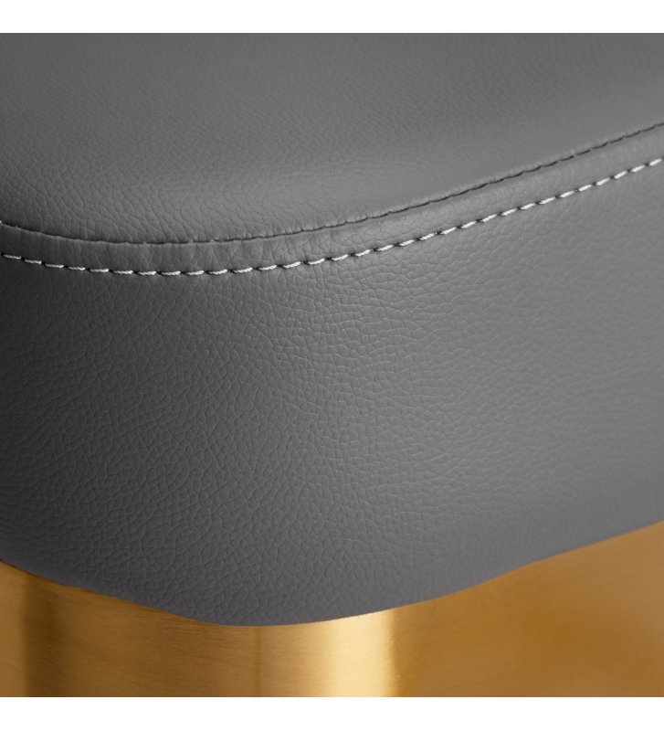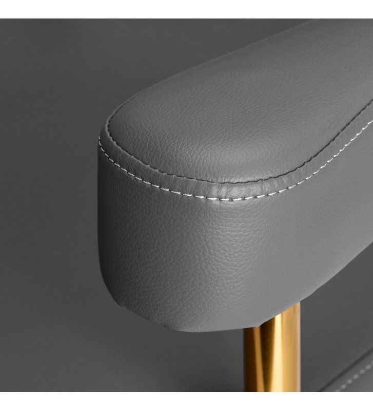 Fotel wypełniony jest pianką, która jest trwała i nie odkształca się, zapewniając komfortowe użytkowanie przez długi czas. Obicie wykonane jest z przyjemnej w dotyku imitacji skóry o specyficznej strukturze. Dzięki użyciu takiego materiału, sprzęt jest odporny na wilgoć, wytrzymały i łatwy w czyszczeniu. Pokrycie w odcieniach szarości oraz ozdobne powierzchnie metalowe lakierowane w barwach złota nadają mu wyraz ponadczasowej elegancji. Wyróżnia go gustowne wykończenie, które nadaje mu ekskluzywny charakter i sprawia, że będzie doskonale prezentować się w wielu profesjonalnych salonach.