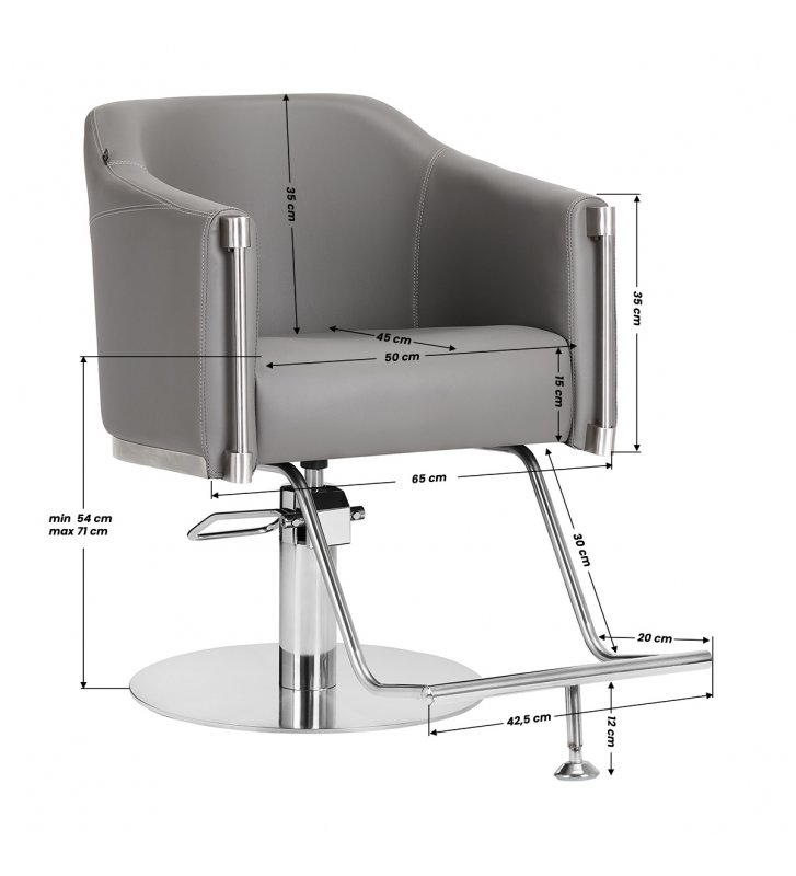 Trwały podnośnik hydrauliczny pozwala na regulację poziomu siedziska w granicach 54-71 cm, nawet w momencie, kiedy klient siedzi na fotelu. Gwarantuje to bardziej ergonomiczną pracę, dzięki możliwości dostosowania wysokości do wzrostu zarówno klienta, jak i fryzjera. Odpowiednio wyprofilowane, zaokrąglone oparcie pozwala na zajęcie dogodnej pozycji, co ma znaczenie zwłaszcza w przypadku zabiegów trwających wiele godzin. Znacznym plusem jest dopasowany do tego modelu podnóżek, który zapewnia stabilne oparcie dla stóp użytkownika.
