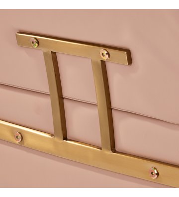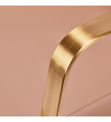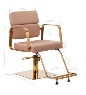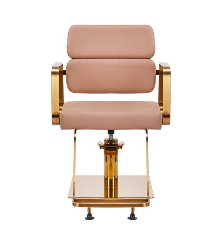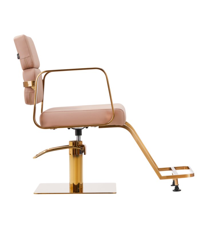 Mechanizm pełnego obrotu, w który jest wyposażony fotel, sprawia, że praca fryzjera staje się bardziej efektywna i wygodna. Solidna, płaska podstawa w kształcie kwadratu gwarantuje stabilność w trakcie użytkowania. Matowo wykończona, gładka powierzchnia nadaje elementowi elegancki wygląd i sprawia, że ten jest łatwy do utrzymania w czystości. Wygodne siedzisko z wypełnieniem z pianki zapewnia wysoki komfort użytkowania, nawet podczas wielogodzinnych zabiegów. Geometryczne, metalowe podłokietniki w odcieniach złota pozwalają na prawidłowe ułożenie barków klienta – sprawia to, że nie chowa głowy w ramionach ani się nie garbi – co wyraźnie ułatwia wykonywanie precyzyjnych zabiegów, w tym strzyżenia. Dedykowany do tego modelu stylowy podnóżek zapewnia stabilne oparcie dla stóp użytkownika.