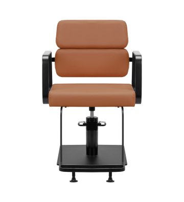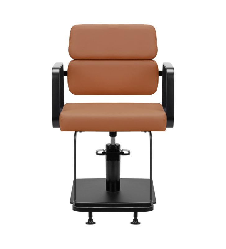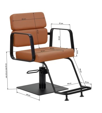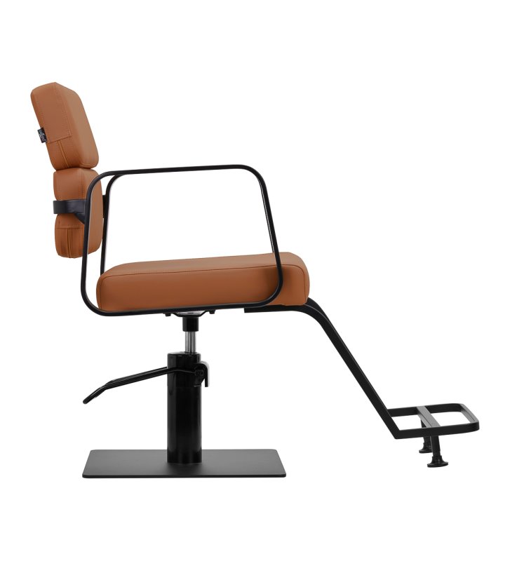 Mechanizm pełnego obrotu, w który jest wyposażony fotel, sprawia, że praca fryzjera staje się bardziej efektywna i wygodna. Solidna, płaska podstawa w kształcie kwadratu gwarantuje stabilność w trakcie użytkowania. Matowo wykończona, gładka powierzchnia nadaje elementowi elegancki wygląd i sprawia, że ten jest łatwy do utrzymania w czystości. Wygodne siedzisko z wypełnieniem z pianki zapewnia wysoki komfort użytkowania, nawet podczas wielogodzinnych zabiegów. Geometryczne, metalowe podłokietniki pozwalają na prawidłowe ułożenie barków klienta – sprawia to, że nie chowa głowy w ramionach ani się nie garbi – co wyraźnie ułatwia wykonywanie precyzyjnych zabiegów, w tym strzyżenia. Dedykowany do tego modelu stylowy podnóżek zapewnia stabilne oparcie dla stóp użytkownika.