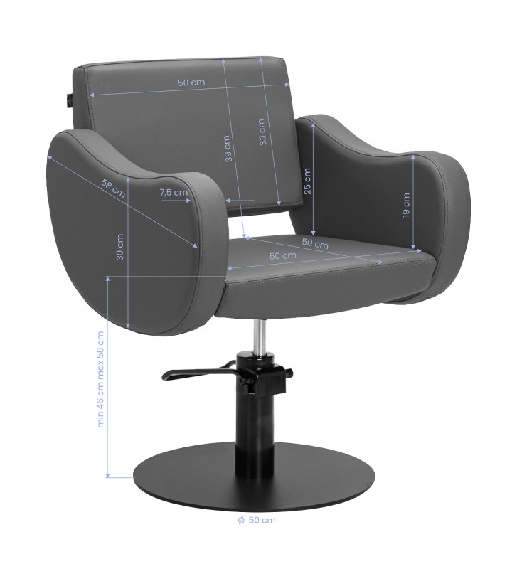 Solidny podnośnik hydrauliczny umożliwia płynną regulację wysokości siedziska w zakresie od 46 do 58 cm – również, gdy klient siedzi na fotelu. To praktyczne rozwiązanie pozwala łatwo dostosować pozycję do wzrostu zarówno klienta, jak i stylisty, wspierając ergonomiczną pracę. Profilowane oparcie zapewnia wygodną pozycję i stabilne podparcie pleców, co ma szczególne znaczenie podczas dłuższych zabiegów. Dodatkowym atutem jest mechanizm pełnego obrotu, który zwiększa swobodę ruchu i ułatwia dostęp do klienta z każdej strony.