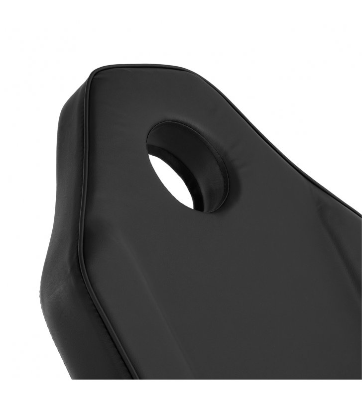 Ukryty pod odpowiednio wyprofilowaną poduszką otwór w zagłówku sprawia, że fotel doskonale sprawdza się zarówno podczas zabiegów na twarz, jak i tych przeprowadzanych na plecach. Stabilne podłokietniki gwarantują użytkownikowi odpowiednie podparcie. Elementy te, dzielone w połowie, są ruchome, dlatego dobrze układają się przy zmianach pozycji oparcia, a dodatkowo mogą być w łatwy sposób zdjęte.