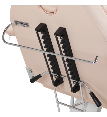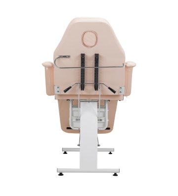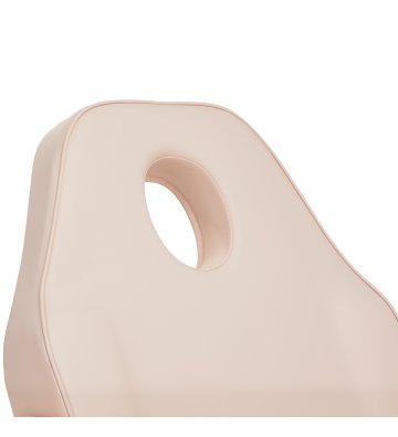 Stabilne, miękkie podłokietniki gwarantują użytkownikowi odpowiednie podparcie. Elementy te, dzielone w połowie, są ruchome, dlatego dobrze układają się przy zmianach pozycji oparcia, a dodatkowo mogą być w łatwy sposób zdjęte. Ukryty pod odpowiednio wyprofilowaną poduszką otwór w zagłówku sprawia, że fotel doskonale sprawdza się zarówno podczas zabiegów na twarz, jak i tych przeprowadzanych na plecach.