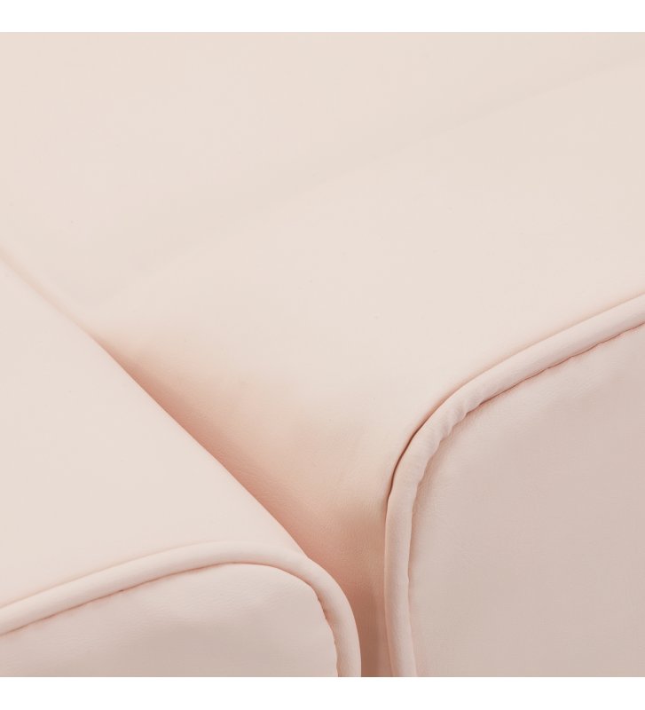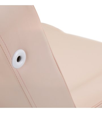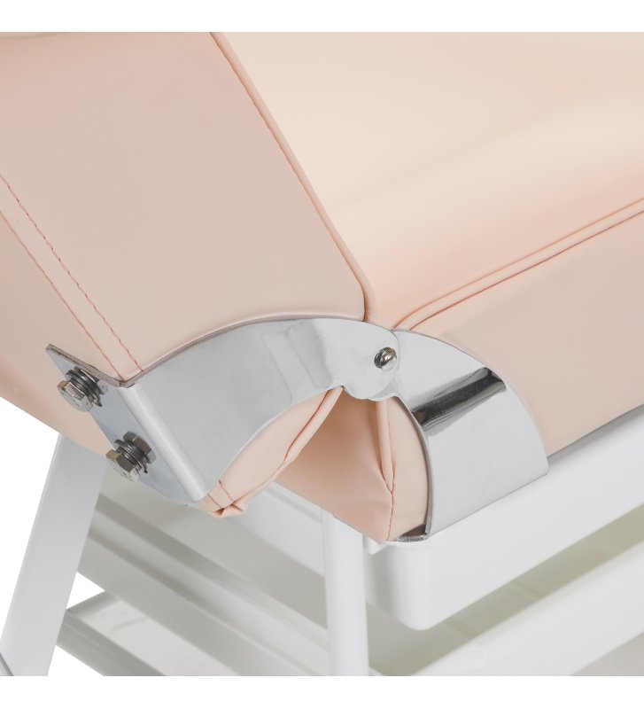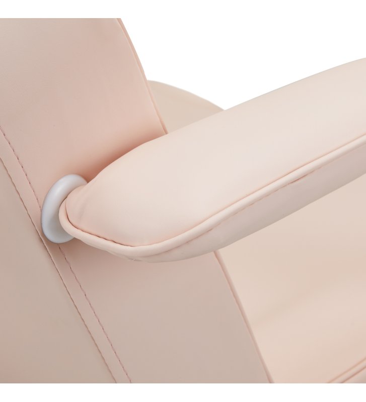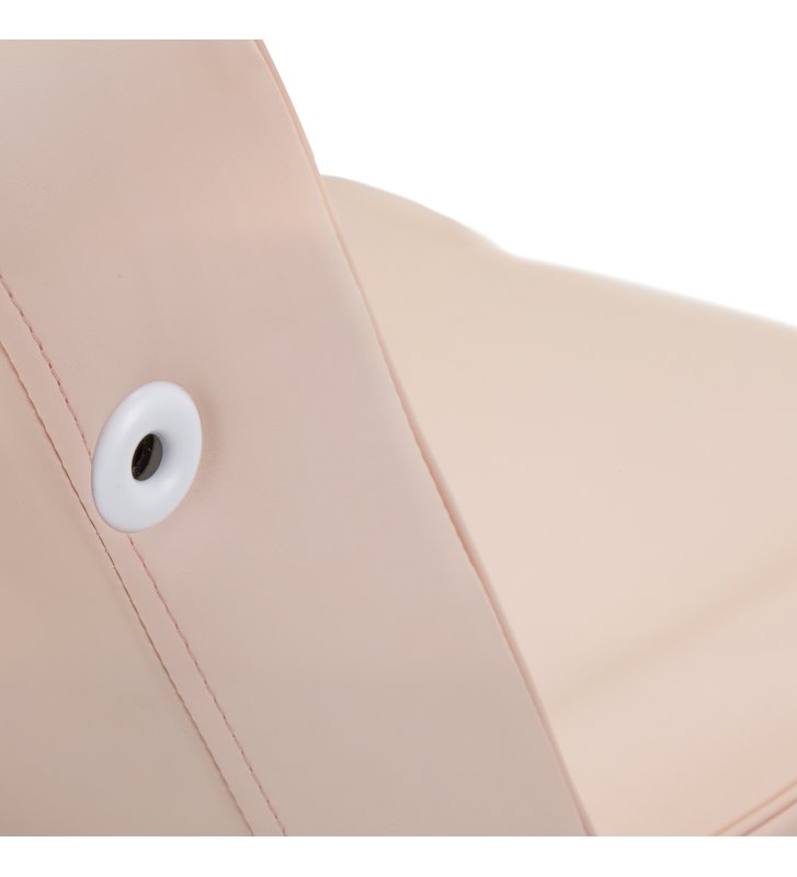 Podstawa fotela posiada stałą wysokość, w związku z czym siedzisko znajduje się na niezmiennym poziomie, który powinien zapewnić komfort w trakcie użytkowania. Solidny metalowy stelaż w odcieniach bieli oraz antypoślizgowe stopki zapewniają niezbędną w trakcie użytkowania stabilność. Fotel wypełniony jest pianką i pokryty imitacją skóry w odcieniach różu. Dzięki użyciu takiego materiału, sprzęt jest komfortowy w użytkowaniu, odporny na wilgoć oraz łatwy w czyszczeniu. Odpowiednio wyprofilowane obszycia nadają ergonomiczny kształt siedzisku. Prosty design oraz elegancka kolorystyka ułatwiają mu wpasowanie się w każde wnętrze.