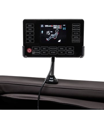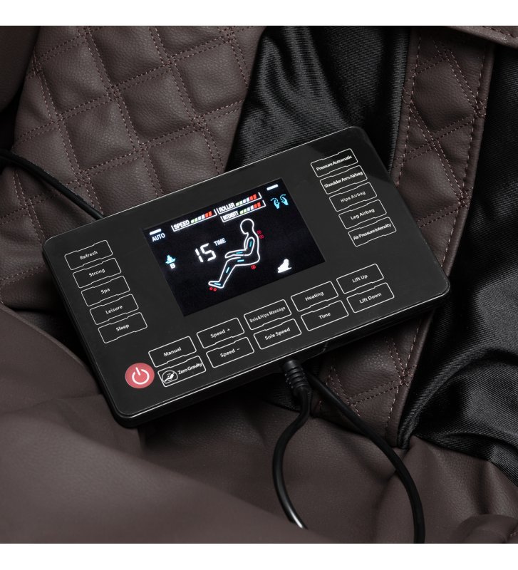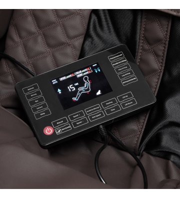 Przejrzysty panel sterowania z ekranem LCD zapewnia łatwą i intuicyjną obsługę fotela. Panel można wygodnie umieścić na uchwycie zamontowanym na prawym podłokietniku lub trzymać w dłoniach. Wyrazisty wyświetlacz pokazuje bieżącą pracę urządzenia, w tym masowane obszary ciała, intensywność masażu, czas zabiegu oraz wybrany program. Panel umożliwia precyzyjne dostosowanie ustawień fotela i funkcji masażu, a także wybór długości sesji, która może trwać 5, 10, 15, 20, 25 lub 30 minut.