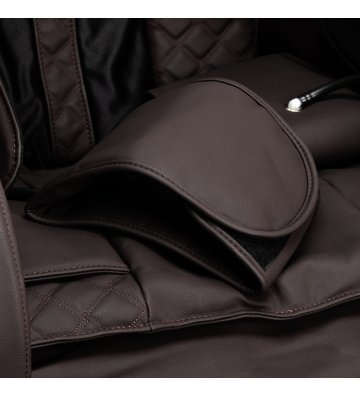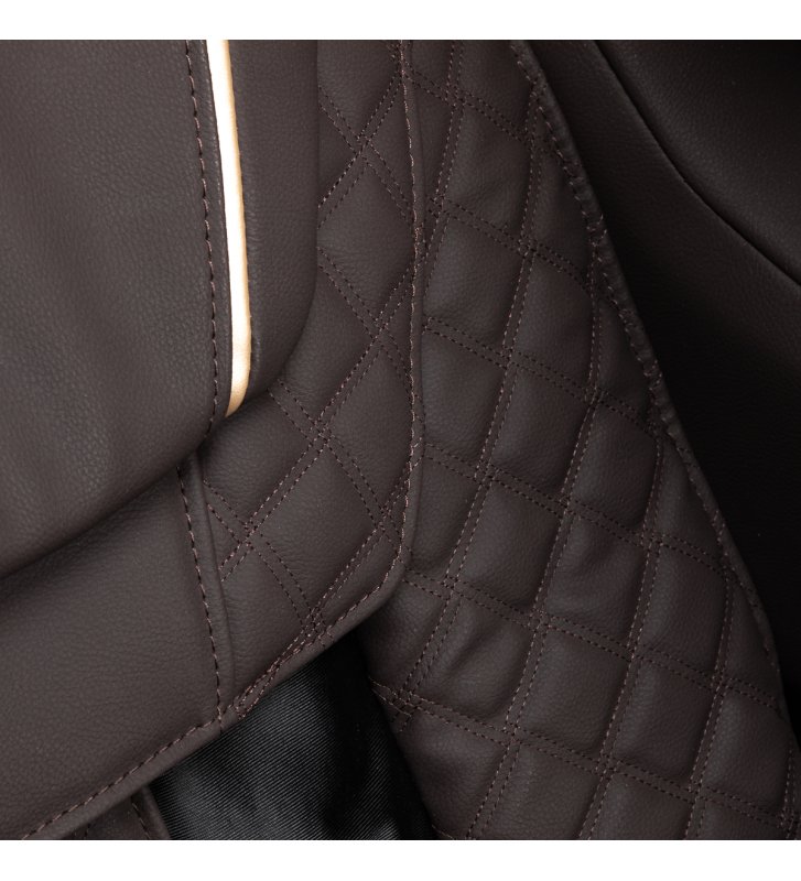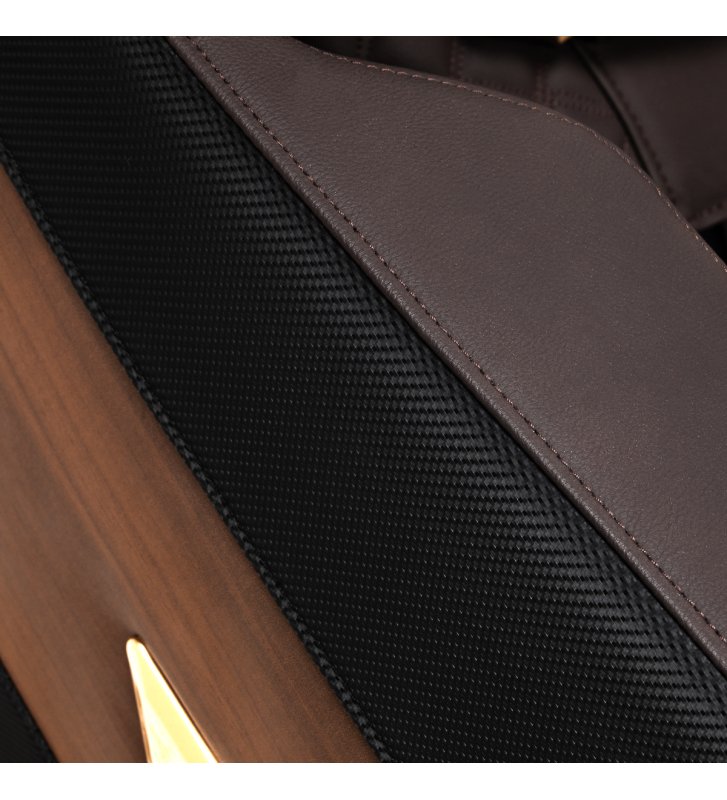 Wnętrze fotela pokryte jest przyjemną w dotyku imitacją skóry w głębokim odcieniu ciemnego brązu. Materiał ten charakteryzuje się wysoką odpornością na wilgoć oraz łatwością w czyszczeniu, co zapewnia wygodę użytkowania. Połączenie syntetycznej skóry imitującej drewno z teksturowanym materiałem na zewnętrznych częściach fotela przyciąga wzrok, nadając całości oryginalny i elegancki wygląd. Starannie wykonane obszycia podkreślają stylowy design, a solidna konstrukcja zapewnia trwałość na lata. Kompaktowy model o estetycznym wykończeniu idealnie wpasuje się w każde wnętrze. Fotel masujący Sakura 306A to idealne rozwiązanie na chwilę relaksu – szczególnie po wymagającym dniu lub intensywnym treningu.