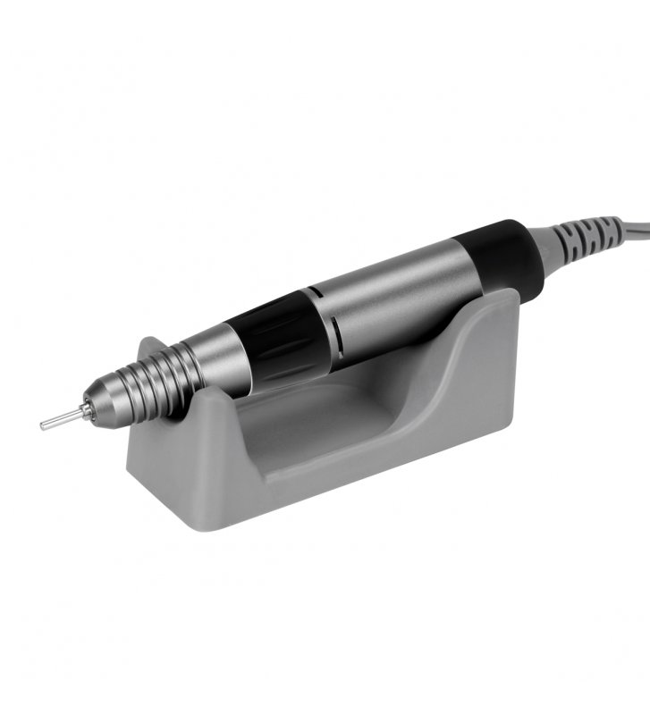 Czerwona dioda obok włącznika sygnalizuje stan pracy urządzenia. Prędkość obrotów głowicy frezarki można w łatwy sposób, płynnie dostosowywać przy użyciu specjalnego pokrętła w zakresie od 0 do 35 000 obrotów na minutę. Przełącznik z przodu urządzenia sprawnie zmienia kierunek obrotów, z kolei ten z tyłu pozwala na przestawianie sterowania – między ręcznym a nożnym. Do zestawu jest dołączony pedał, którego funkcja polega na włączaniu frezarki z uprzednio ustawionymi obrotami. Zapewnia to swobodną, komfortową pracę, dzięki możliwości sterowania urządzeniem bez zajmowania rąk. W trakcie pracy głowicę bezpiecznie można odłożyć na dedykowany silikonowy stojak lub odwiesić dzięki wygodnemu plastikowemu uchwytowi, który da się zamontować po obu stronach urządzenia.