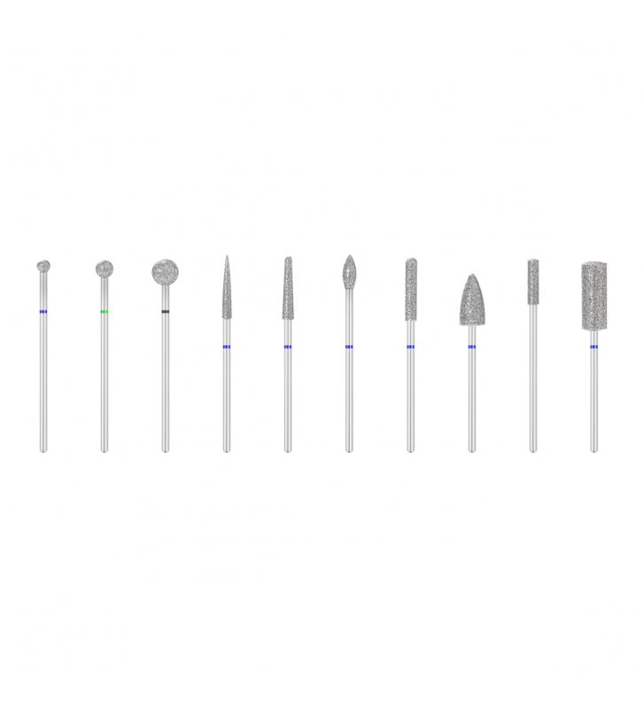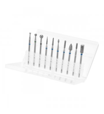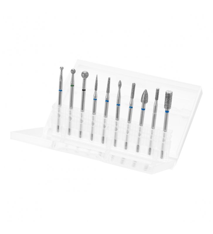 Profesjonalny zestaw frezów diamentowych wykonanych są z najwyższej jakości materiałów przeznaczony jest do oczyszczania, wygładzania oraz formowania skórek oraz bocznych wałów okołopaznokciowych. Frezy są szczególnie przydatne w przygotowaniu paznokci do manicure kombinowanego. Możemy również przy ich pomocy usunąć zgrubienia przy płytce paznokcia czy nadać kształt paznokciu oraz ściągnąć lakiery hybrydowe, żele, akryle nie uszkadzając przy tym płytki paznokcia.