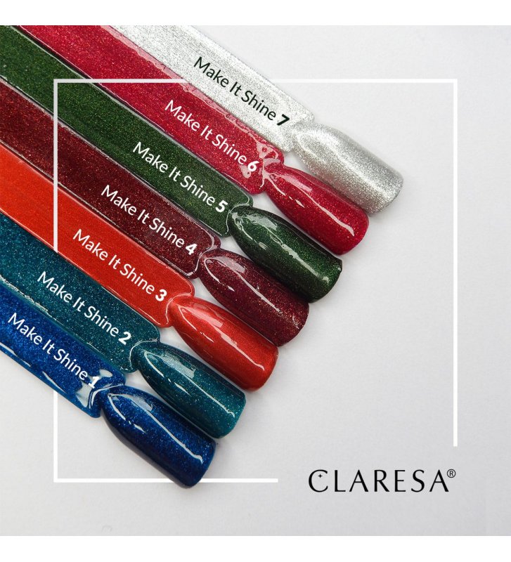 Świąteczne stylizacje paznokci mają zazwyczaj jeden mianownik - iskrzące drobiny. Chcąc wyczarować błyszczące zdobienia, możesz sięgnąć po brokatowe pyłki, żele lub naklejki. Dla tych, którzy cenią sobie prostotę wykonania lub jednolity wzór, stworzona została kolekcja 7 kolorów lakierów hybrydowych Claresa Make It Shine! Granaty, brązy, pomarańcze, zielenie, czerwienie oraz srebro to kolory, które jednoznacznie kojarzą się z okresem zimowo-świątecznym, dlatego stawiając na klasykę, Claresa stworzyła kolekcję opartą o skojarzenia związane z tym magicznym okresem. Kolekcja Make It Shine! to 7 lakierów hybrydowych z mieniącymi się drobinkami, które doskonale sprawdzą się zarówno przy wigilijnym stole, jak i na noworocznej imprezie