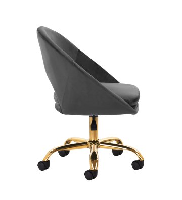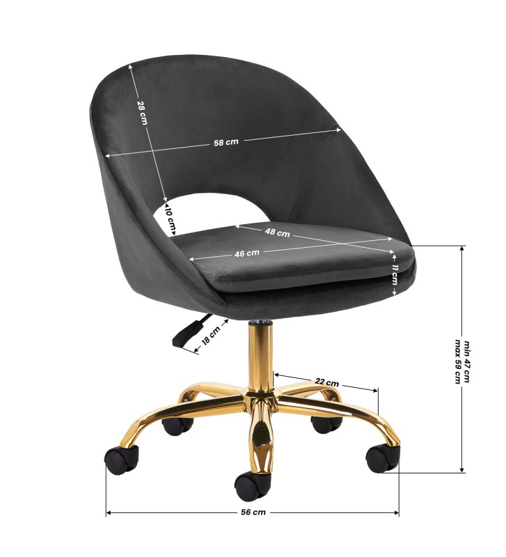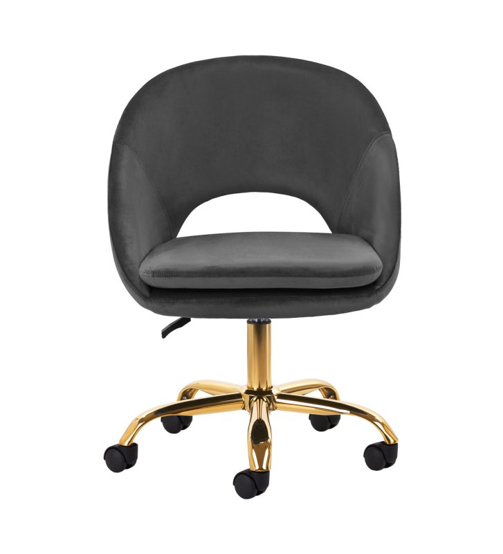 Proste wykończenie sprawia, że mebel wpada w oko. Przyjemne w dotyku, welwetowe obicie w odcieniach szarości nadaje mu wyjątkowego charakteru. Podstawa w odcieniach złota dodaje elegancji, idealnie komponując się z welwetem, a funkcjonalne koła zapewniają mobilność, ułatwiając przestawianie krzesła oraz poruszanie się po salonie w trakcie pracy. Estetyka wykonania, komfort użytkowania oraz ergonomicznie wyprofilowane oparcie sprawiają, że krzesło spełni wymagania nawet najbardziej wymagających użytkowników.