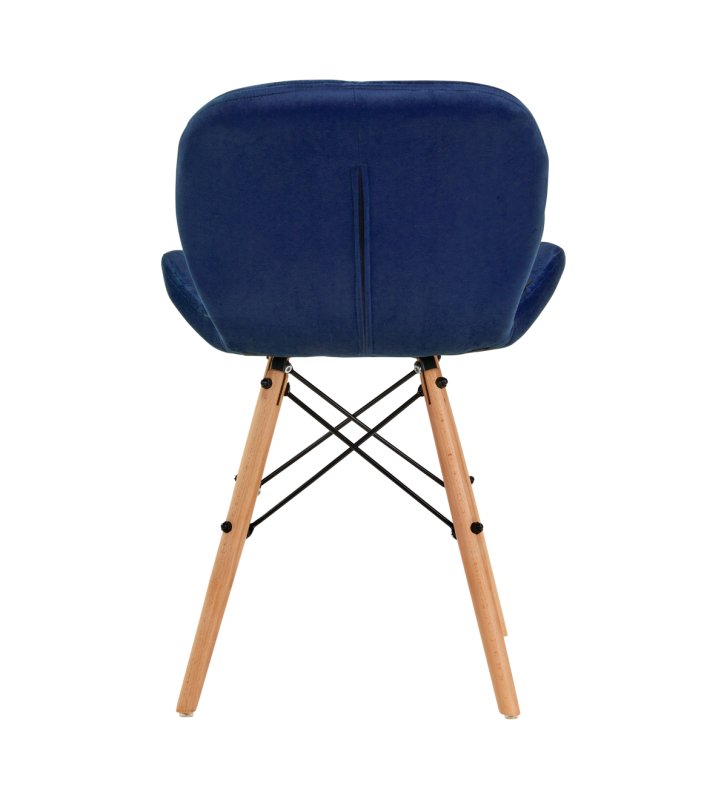 Siedzisko pokryte jest tapicerką z przyjemnego w dotyku welwetu w odcieniach granatu. Nadaje mu to ekskluzywny wygląd i zapewnia komfort użytkowania. Staranne przeszycia w geometrycznych kształtach stanowią elegancki sznyt, a łączący nogi metalowy stelaż w odcieniach czerni dodaje meblowi stabilności. Drewniane, matowo wykończone nóżki zakończono plastikowymi zabezpieczeniami, dodatkowo chroniącymi przed przypadkowym uszkodzeniem. Krzesło w stylu skandynawskim jest komfortowym meblem, który stanie się ozdobą recepcji każdego salonu kosmetycznego.