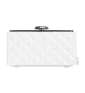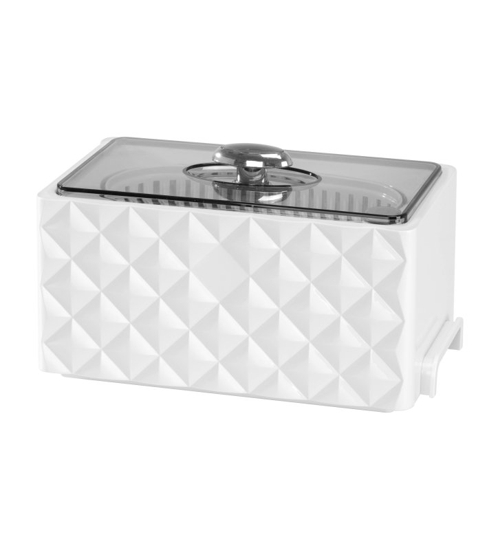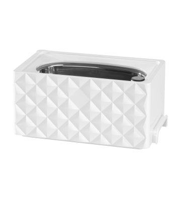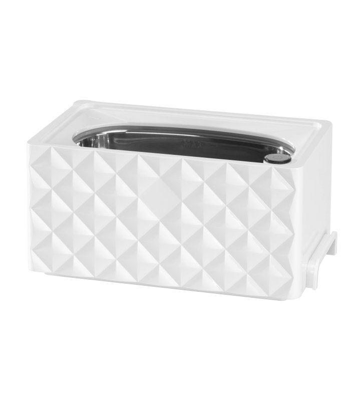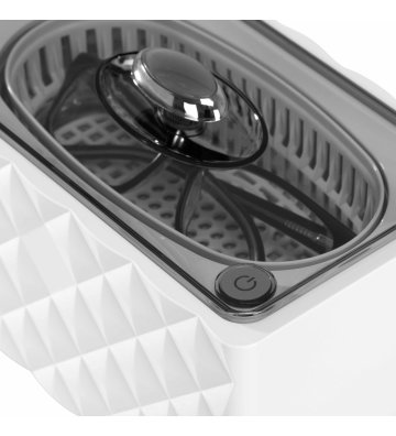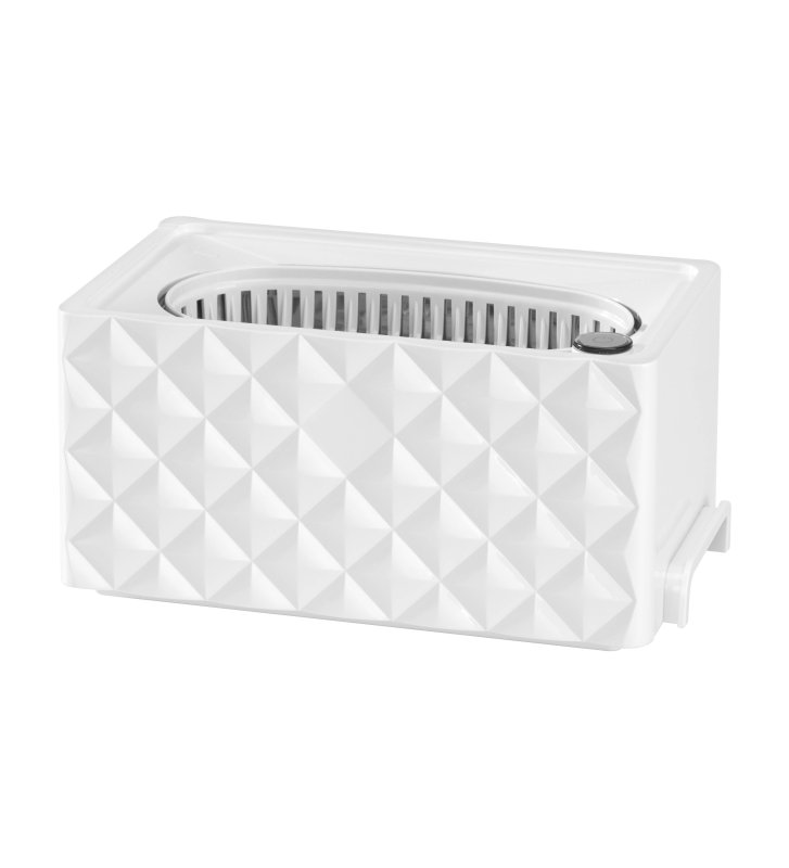 Niewielkie gabaryty sprawiają, że ta myjka ultradźwiękowa jest bardzo prosta w transporcie, a dodatkowo nie zajmuje zbyt wiele miejsca w salonie. Estetyczna, zdobiona obudowa wykonana jest z tworzywa sztucznego w odcieniach bieli, a przejrzysta pokrywa pozwala na bieżąco obserwować przebieg procesu i nie utrudnia włączenia urządzenia, mimo że guzik ukryty jest pod nią. Pojemnik ma we wnętrzu oznaczenie maksymalnego napełnienia płynem (do 300 ml). Stabilność urządzenia zapewniają antypoślizgowe stopki.