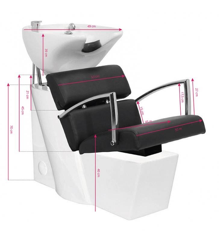 Profesjonalna myjnia fryzjerska -stabilna, niezwykle wygodna, solidnie wykonana. Nowoczesny design czyni z niej piękne dopełnienie wyposażenia nowoczesnego salonu fryzjerskiego. Siedzisko o opływowym kształcie, wykonane z wysokiej jakości łatwej w pielęgnacji ekoskóry. Silikonowa podkładka pod głowę stabilizuje głowę klienta i pozwala na jej wygodne ułożenie na myjce. Misa myjki w kolorze białym, z możliwością regulacji swojego nachylenia. Myjnia w kolorze czarnym.