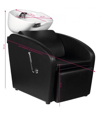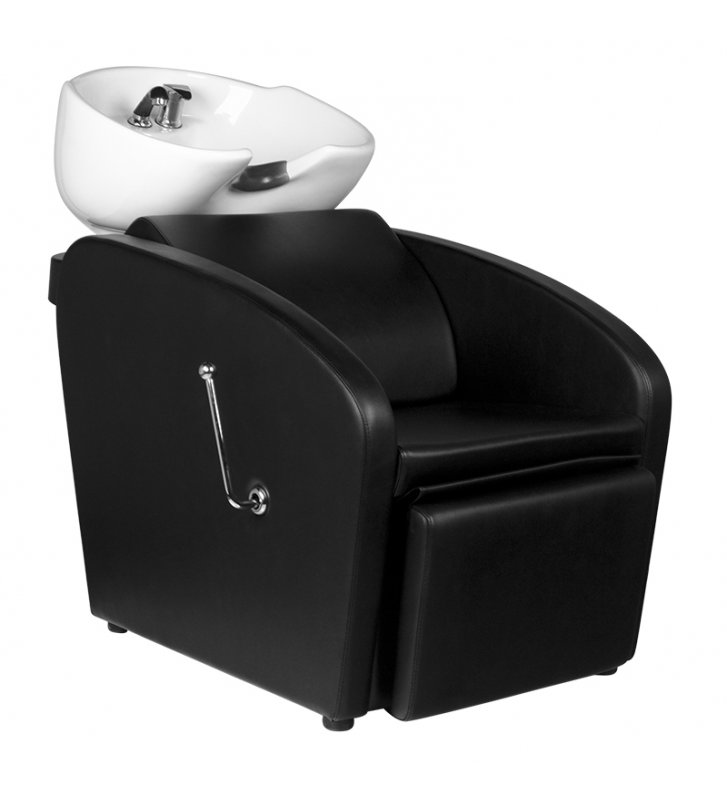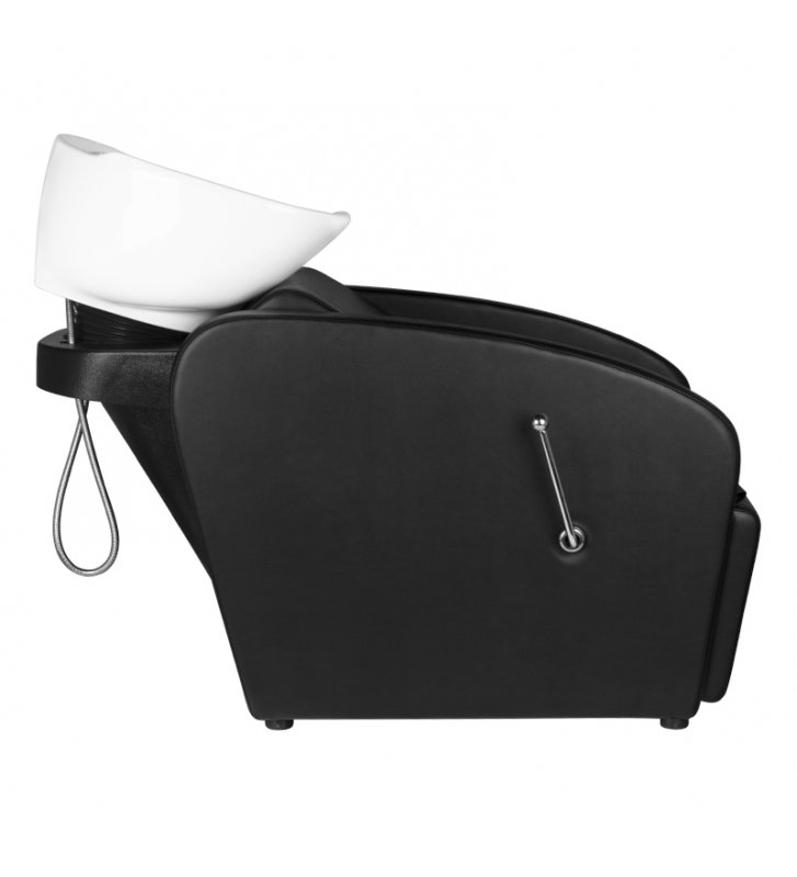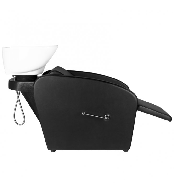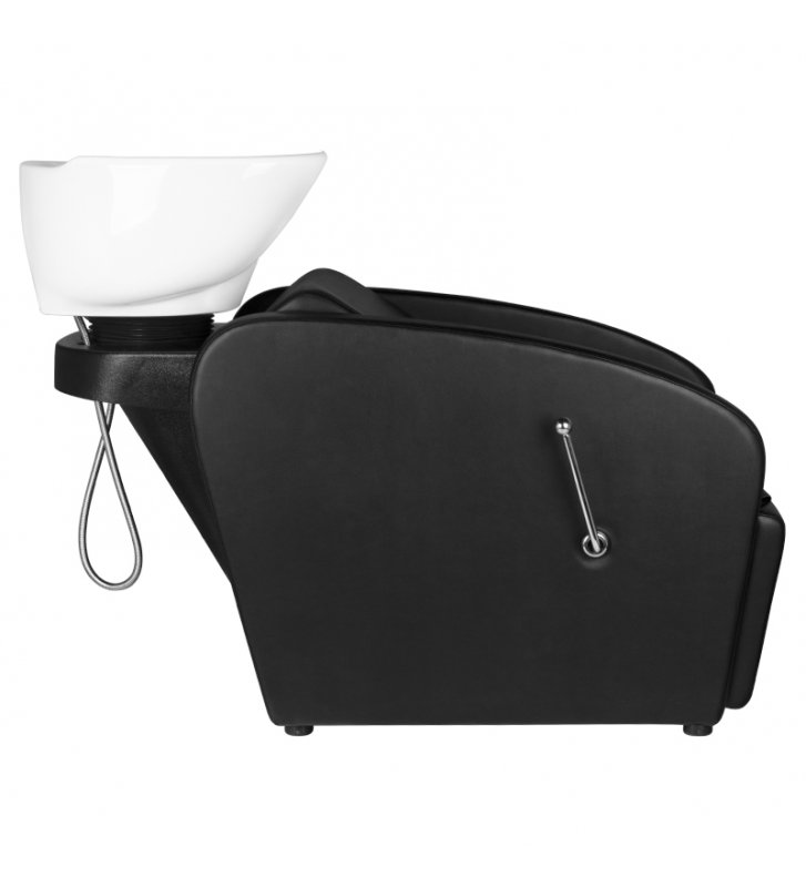 Profesjonalna myjnia fryzjerska -stabilna, niezwykle wygodna, solidnie wykonana. Nowoczesny design czyni z niej piękne dopełnienie wyposażenia nowoczesnego salonu fryzjerskiego. Siedzisko wykonane z wysokiej jakości ekoskóry, z ciekawym przeszyciem bocznym. Silikonowa podkładka pod głowę stabilizuje głowę klienta i pozwala na jej wygodne ułożenie na myjce. Misa myjki w kolorze czarnym, z możliwością regulacji swojego nachylenia. Myjnia w kolorze czarnym.