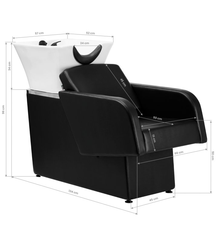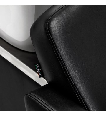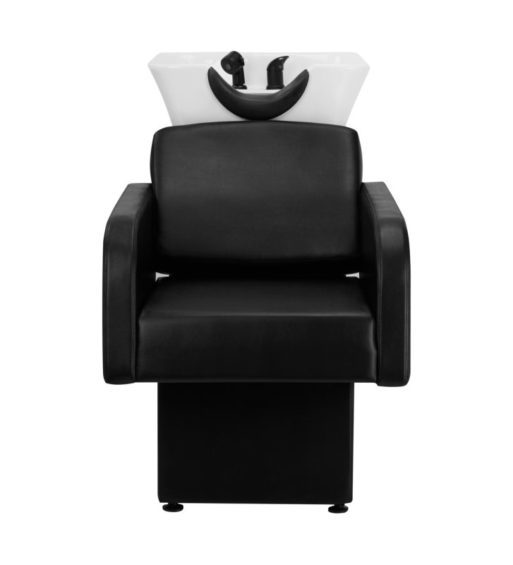 Odpowiednio wyprofilowany fotel wypełniony trwałą pianką zapewnia odpowiednie wsparcie lędźwi, a co za tym idzie wysoki komfort użytkowania. Podłokietniki o ciekawym kształcie pozwalają na prawidłowe ułożenie barków klienta. Przyjemne w dotyku pokrycie ze skóry syntetycznej w odcieniach czerni zapewnia wieloletnią wytrzymałość oraz łatwość czyszczenia. Oryginalny, elegancki wygląd myjni nadaje wnętrzom niepowtarzalnego wyrazu. Nóżki dodają stabilności i subtelnie podkreślają stylowy charakter myjni. W zestawie znajduje się kompletna armatura w odcieniach czerni, w tym bateria, słuchawka prysznicowa oraz dedykowane węże, aby zapewnić całkowity zestaw narzędzi do pracy.