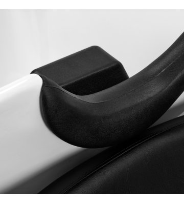 Atrakcyjna wizualnie biała ceramiczna misa umywalki o ciekawym kształcie i odpowiedniej głębokości zapobiega nadmiernemu rozchlapywaniu wody czy używanych w trakcie zabiegu produktów. Pozwala to na komfortowe i efektywne wykonywanie szerokiej gamy usług. Kąt nachylenia misy można dostosowywać, dzięki czemu łatwo o dopasowanie do indywidualnych potrzeb. Zastosowany materiał wysokiej jakości sprawia, że umywalka jest wytrzymała, odporna na przebarwienia i zadrapania oraz bardzo łatwa do czyszczenia. Odpowiednio wyprofilowany kołnierz oraz nachylone oparcie zapewniają wsparcie i wygodę w trakcie mycia włosów, a dzięki komfortowej nakładce z tworzywa sztucznego w odcieniach czerni klient nie odczuje nieprzyjemności związanych z chłodem ceramicznej powierzchni.