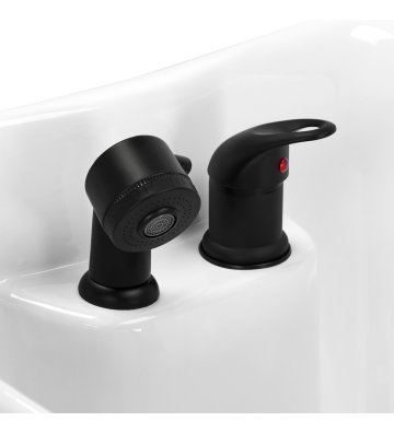 Myjnia wyposażona została w baterię z mieszaczem, co zapewnia łatwy dostęp do ciepłej oraz zimnej wody. Pozwala to dopasować temperaturę do indywidualnych preferencji klienta. Dedykowane miejsce na odłożenie słuchawki ułatwia pracę, a korek wraz ze specjalnym sitkiem pozwala na kontrolę przepływu wody oraz utrzymanie wysokich standardów higieny w salonie. Przyłącze wody zostało umieszczone wewnątrz podstawy, co umożliwia sprawne ukrycie wszelkich rur. Myjnia wyprofilowana została w taki sposób, że zapewnia wygodę podczas wykonywania różnorodnych zabiegów. Doskonałe połączenie funkcjonalności i udogodnień sprawi, że praca w salonie fryzjerskim stanie się jeszcze bardziej komfortowa.