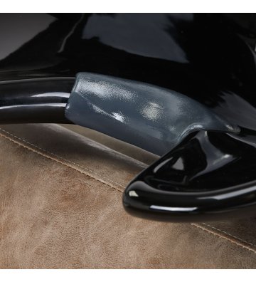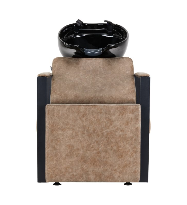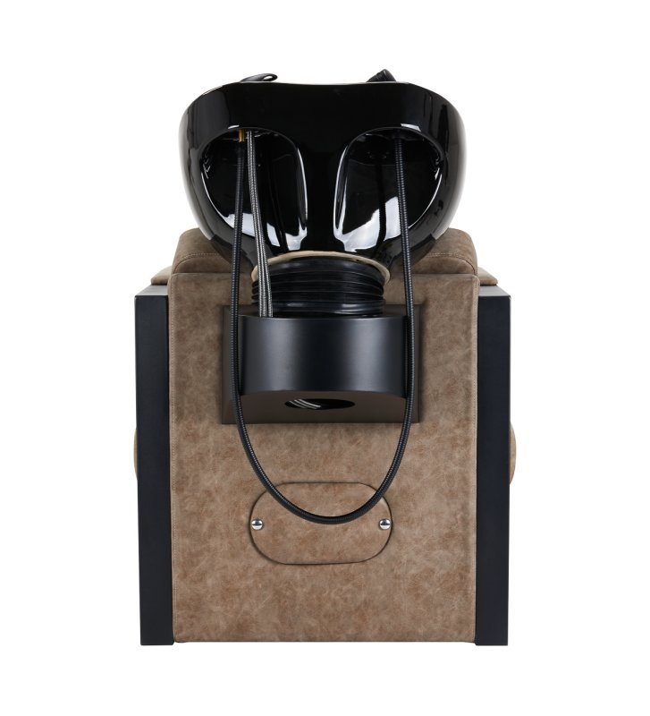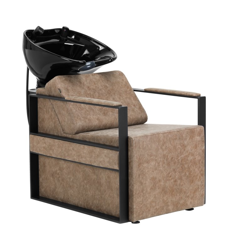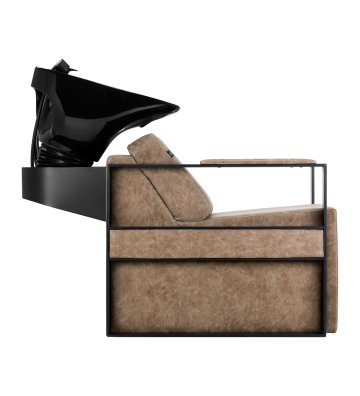 Odpowiednio wyprofilowany fotel wypełniony trwałą pianką zapewnia wysoki komfort użytkowania, a geometryczne, częściowo tapicerowane podłokietniki pozwalają na prawidłowe ułożenie barków klienta. Oparcie umieszczone pod optymalnym kątem sprzyja doskonałemu wsparciu kręgosłupa. Pokrycie ze skóry syntetycznej w odcieniach brązu gwarantuje wieloletnią wytrzymałość oraz łatwość czyszczenia. Oryginalny, elegancki wygląd myjni nadaje wnętrzom niepowtarzalnego wyrazu. Nóżki dodają stabilności i subtelnie podkreślają stylowy charakter myjni. W zestawie znajduje się kompletna armatura o matowym wykończeniu w odcieniach czerni, w tym bateria, słuchawka prysznicowa oraz dedykowane węże, aby zapewnić całkowity zestaw narzędzi do pracy.