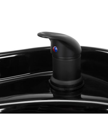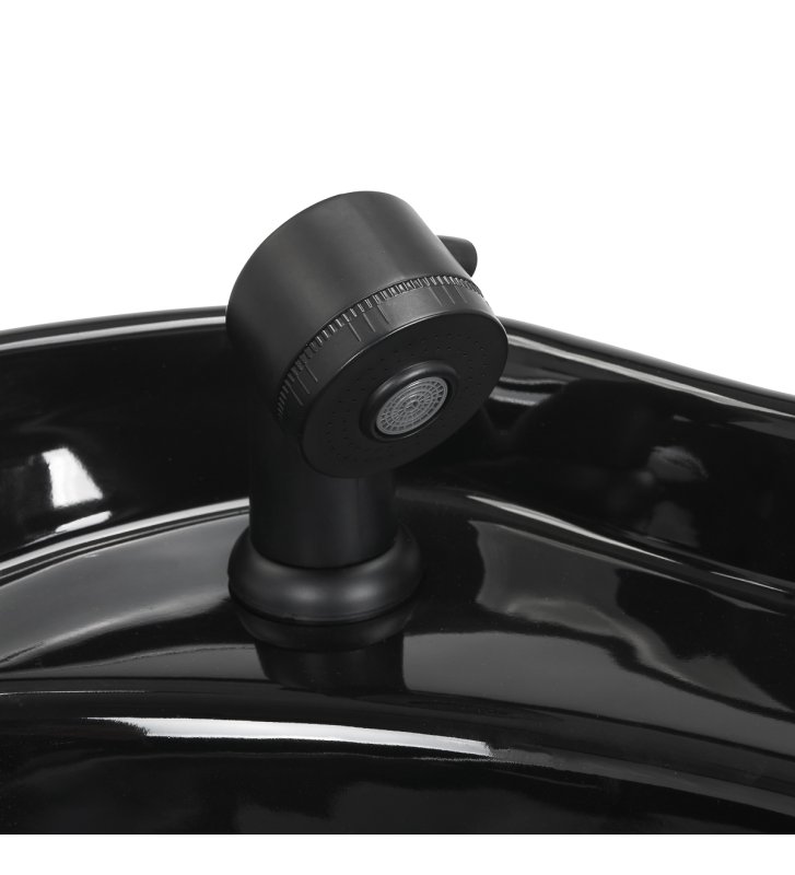 Głębokość ceramicznej misy umywalki w odcieniach czerni zapobiega nadmiernemu rozchlapywaniu wody oraz używanych w trakcie zabiegu produktów. Pozwala to na komfortowe i efektywne wykonywanie szerokiej gamy usług fryzjerskich. Ruchomość misy umożliwia łatwe dopasowanie kąta jej nachylenia do indywidualnych potrzeb. Zastosowany materiał sprawia, że umywalka jest wytrzymała, odporna na przebarwienia i zadrapania oraz bardzo łatwa do utrzymania w czystości. Odpowiednio wyprofilowany kołnierz zapewnia optymalne wsparcie oraz wygodę w trakcie mycia włosów, a komfortowa nakładka z tworzywa sztucznego w odcieniach czerni sprawia, że klient nie odczuje nieprzyjemności związanych z chłodem ceramicznej powierzchni.