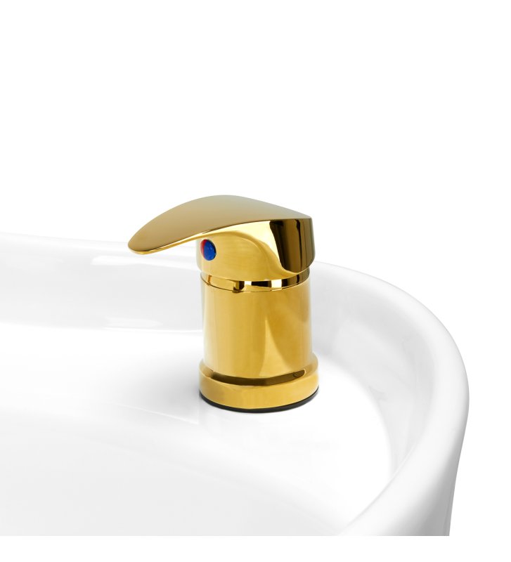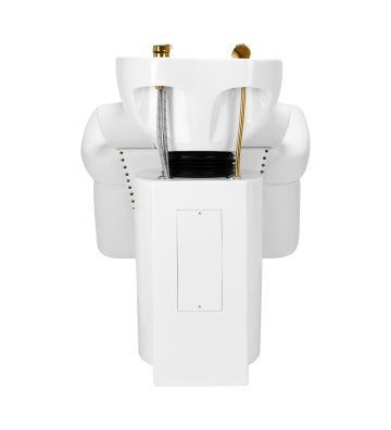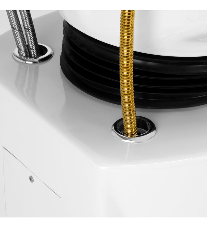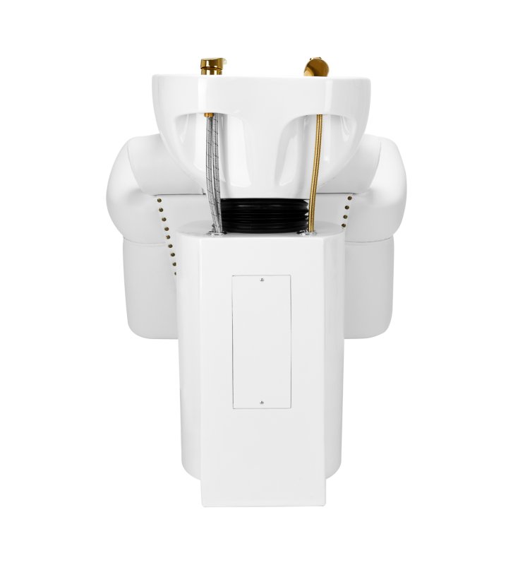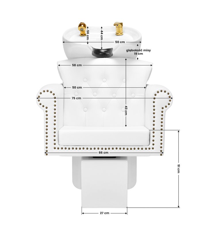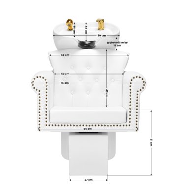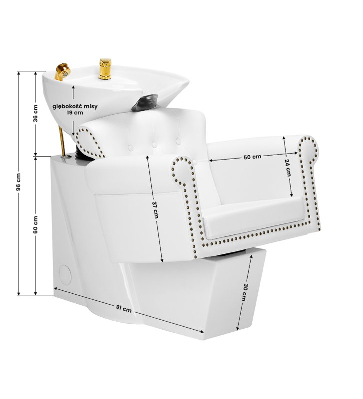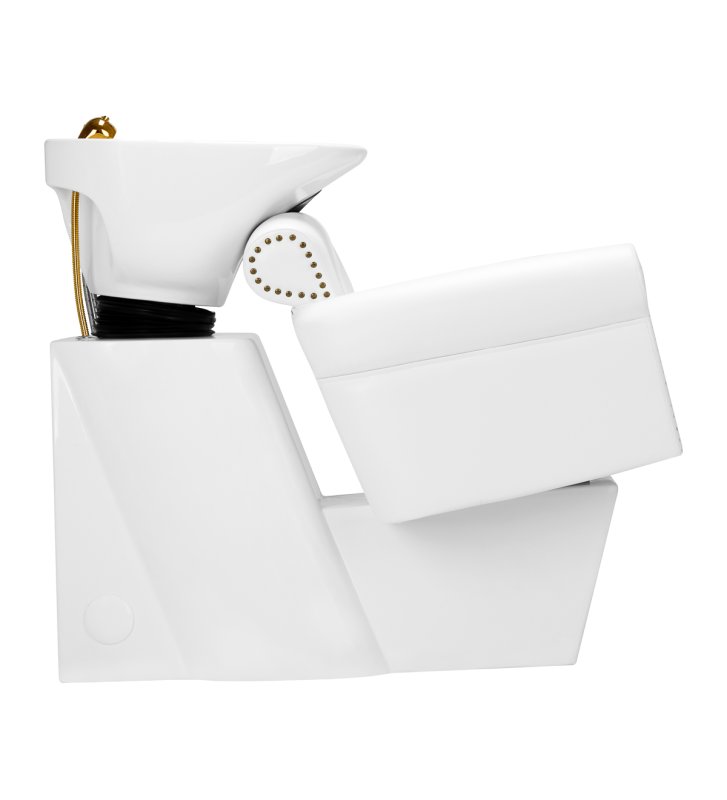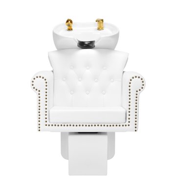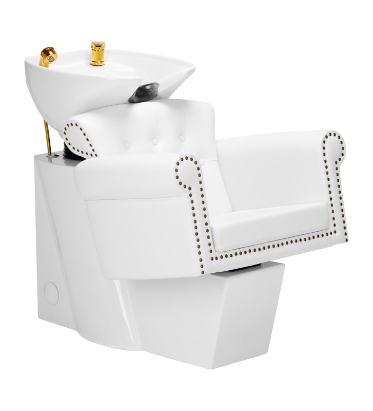 Odpowiednio wyprofilowany fotel wypełniony trwałą pianką zapewnia odpowiednie wsparcie, a co za tym idzie wysoki komfort użytkowania. Podłokietniki pozwalają na prawidłowe ułożenie barków klienta. Przyjemne w dotyku pokrycie ze skóry syntetycznej w odcieniach bieli zapewnia wieloletnią trwałość oraz łatwość czyszczenia. Oryginalny, elegancki wygląd myjni z ozdobnym pikowaniem i złotymi elementami nadaje wnętrzom niepowtarzalnego wyrazu. W zestawie znajduje się kompletna armatura w odcieniach złota, w tym bateria, słuchawka prysznicowa oraz dedykowane węże, aby zapewnić całkowity zestaw narzędzi do pracy.