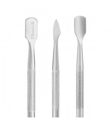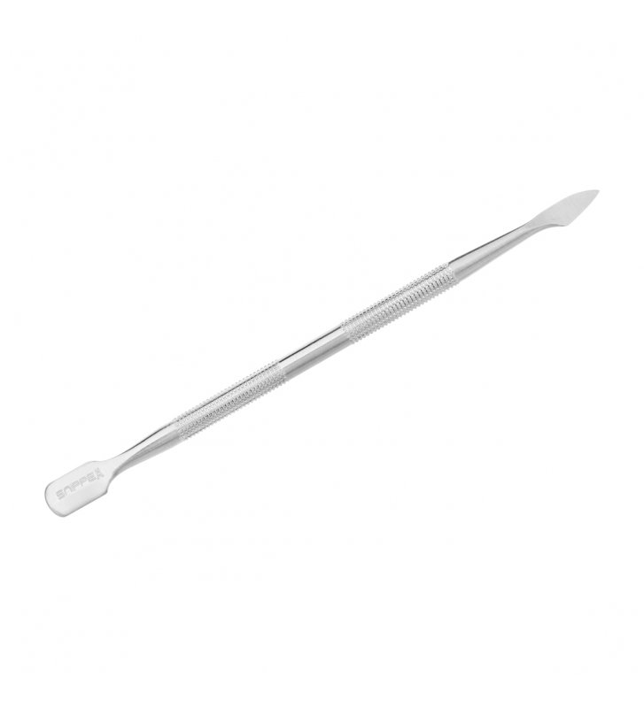 • Zaokrąglona łopatka doskonale sprawdzi się od odsuwania skórek. Jej małe wymiary pozwolą na dotarcie również do trudniej dostępnych miejsc. Profilowana końcówka jest oszlifowana w taki sposób, by skutecznie usuwać skórki, jednocześnie nie uszkadzając płytki paznokcia.
