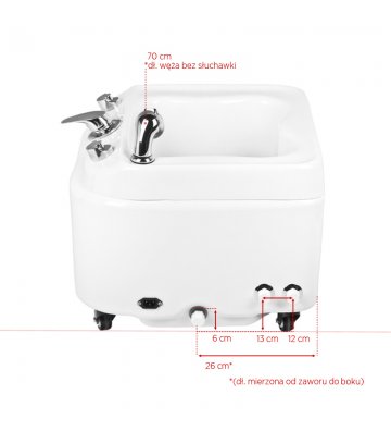 Niezastąpiony przy zabiegach pedicure brodzik na kółkach, z możliwością bezpośredniego podłączenia do odpływu wody, dzięki temu zabiegi pedicure będą wykonywane na najwyższym poziomie.