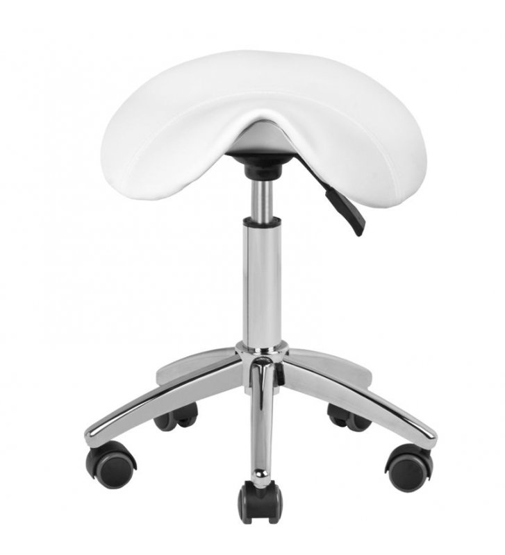 Wygodny, stabilny taboret kosmetyczny bez oparcia, z profilowanym siedziskiem, na pięcioramiennej podstawie z gumowanymi kółkami,