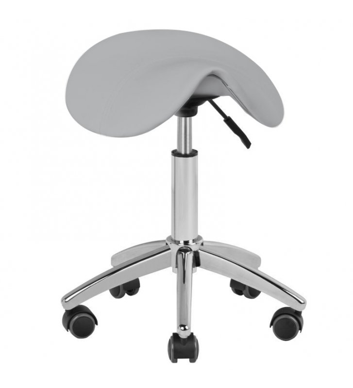 Wygodny, stabilny taboret kosmetyczny bez oparcia, z profilowanym siedziskiem, na pięcioramiennej podstawie z gumowanymi kółkami,