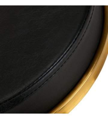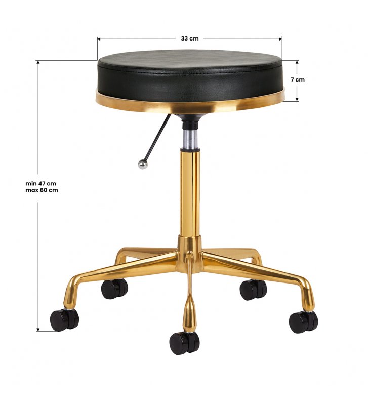 Ten złoty taboret ma wygodne czarne siedzisko pokryte skórą ekologiczną. Znajduje się na stabilnej pięcioramiennej podstawie. Stworzony ze stopów metali, jest trwały i odporny na zniszczenia. Wysokość siedziska jest sprawnie regulowana. Plastikowe kółka pozwalają na łatwą zmianę położenia. Siedzisko jest w pełni obrotowe.
