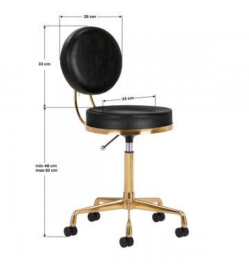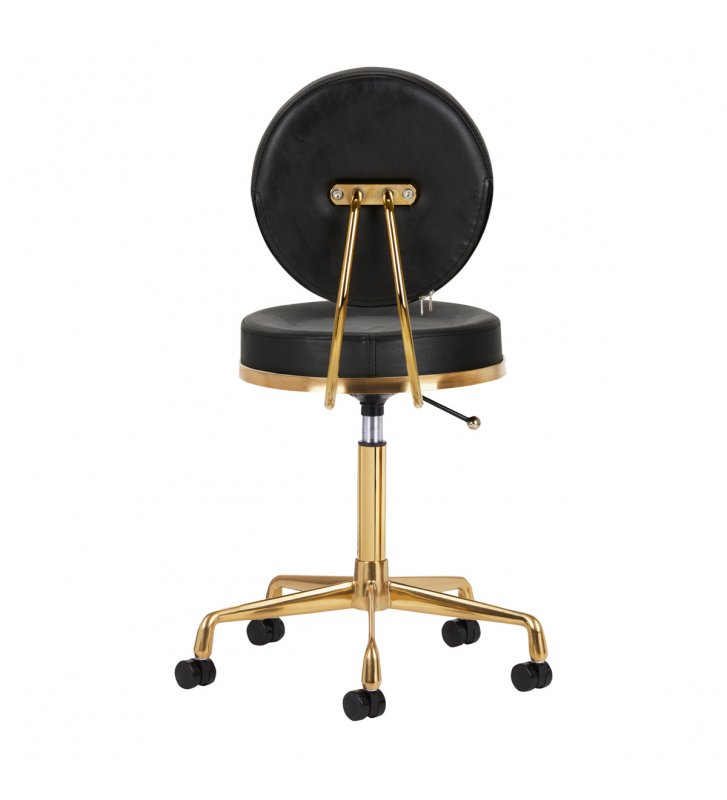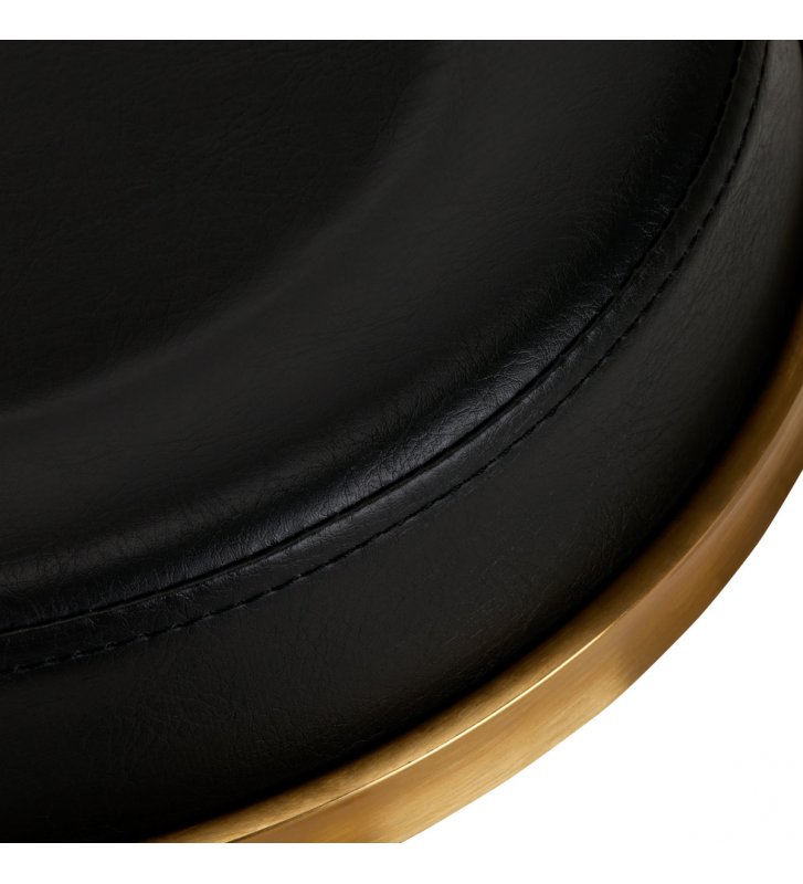 Ten czarno-złoty taboret posiada wygodne siedzisko oraz oparcie pokryte skórą ekologiczną. Znajduje się na stabilnej pięcioramiennej podstawie. Skonstruowany z metalowych części jest trwały i odporny na zniszczenia. Wysokość siedziska jest sprawnie regulowana. Plastikowe kółka pozwalają na łatwą zmianę położenia. Siedzisko jest w pełni obrotowe.