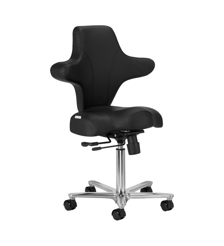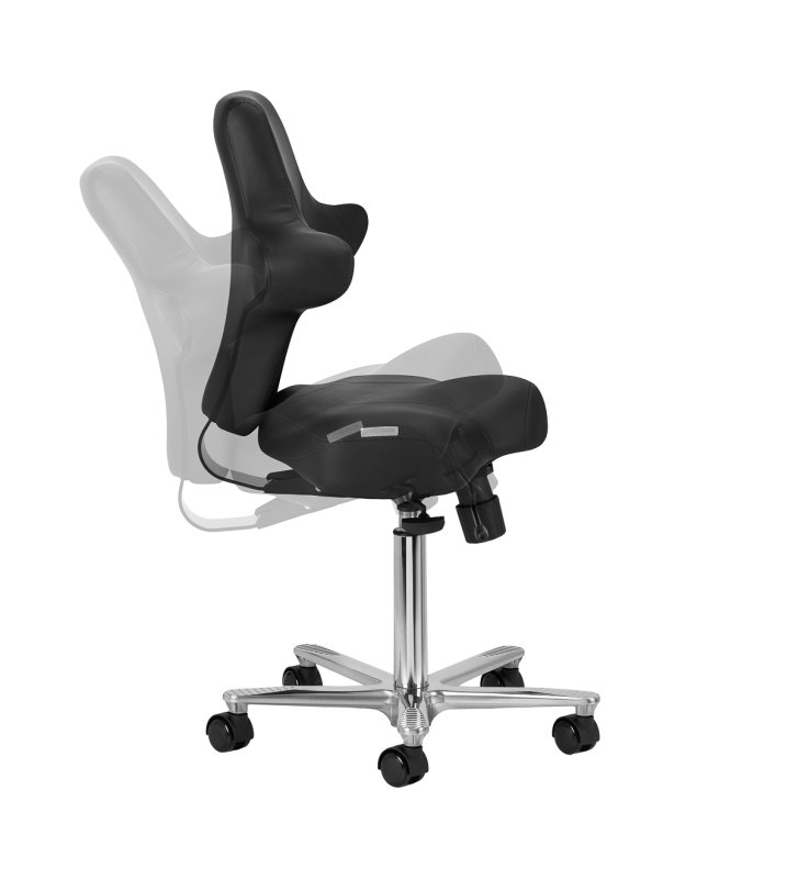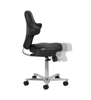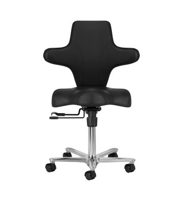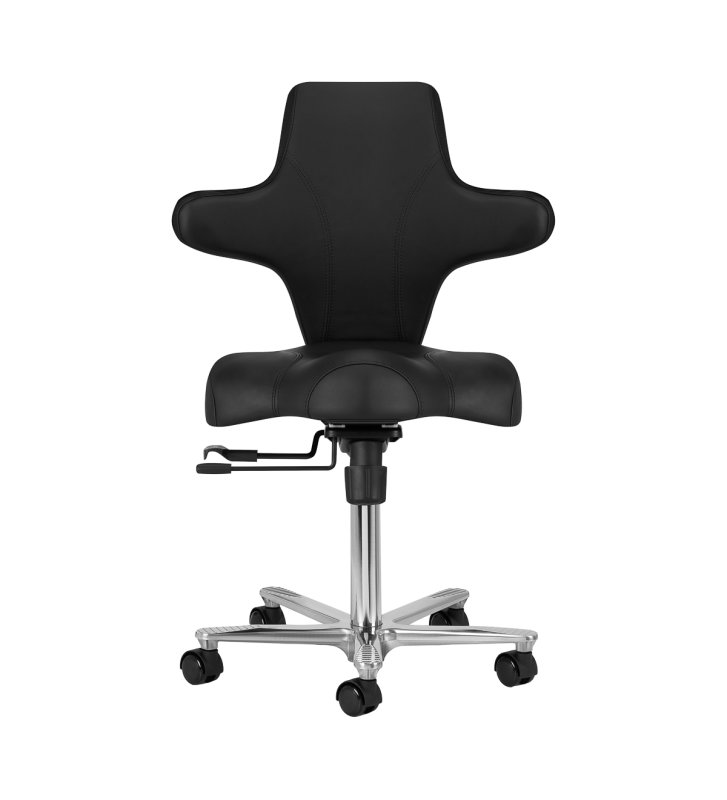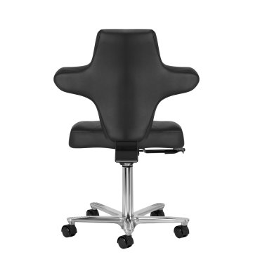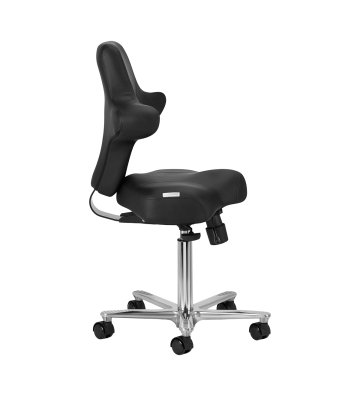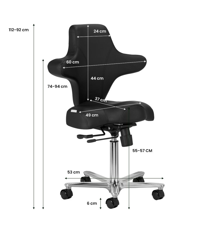 Możliwość regulacji wysokości w zakresie 55-57 cm pozwala przybrać odpowiednią pozycję w trakcie wykonywania usług. Boczne wypustki umożliwiają podparcie rąk podczas siadania na krześle tyłem, zwłaszcza w trakcie usług takich jak wykonywanie masażu czy makijażu. Mechanizm pełnego obrotu, że praca staje się bardziej efektywna i wygodna. Krzesło posiada również funkcję kołyski z możliwością blokady, co pozwala na ergonomiczne ułożenie ciała podczas pracy. Wysunięcie siedziska również można manualnie dostosowywać.